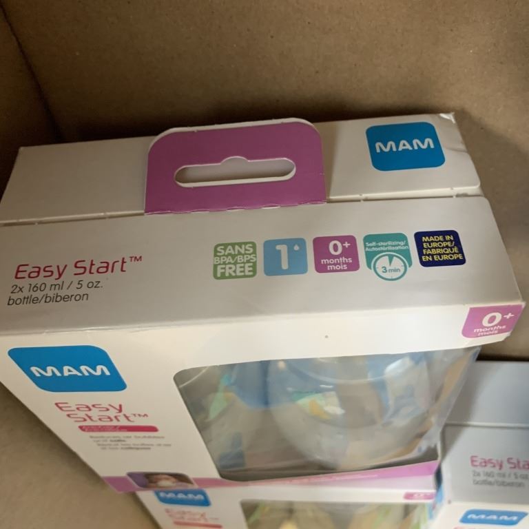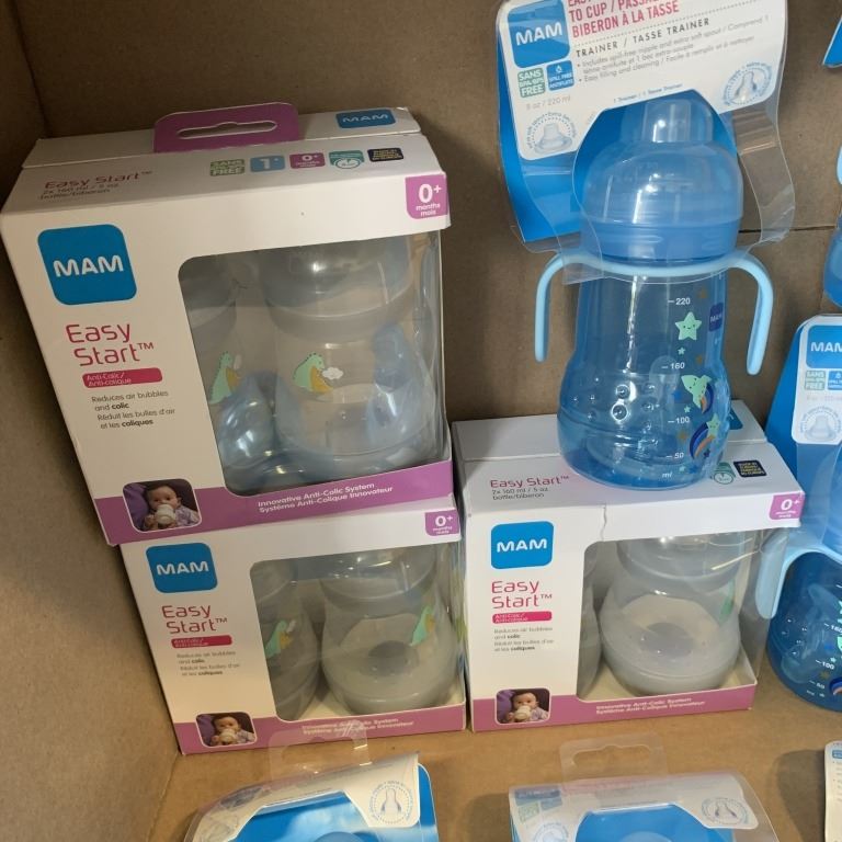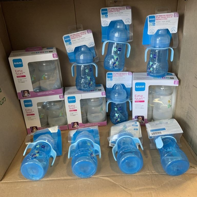 LOT OF NEW MAM BABY BOTTLES AND SIPPY CUPS (3) SETS OF 5 OZ BOTTLES, (1) SET OF 9OZ BOTTLES AND (8) 8OZ TRAINER CUPS