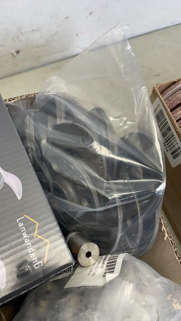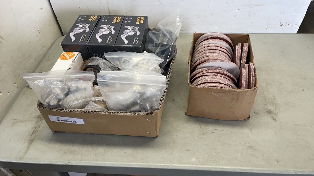 LOT OF NEW SANDING DISCS, LEVEL LOCKING HANDLES AND MORE