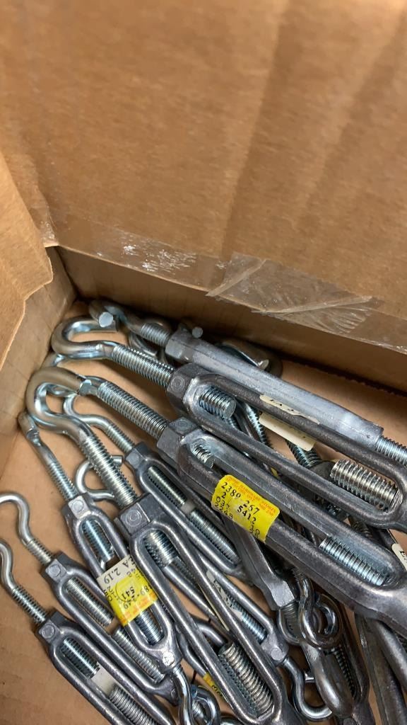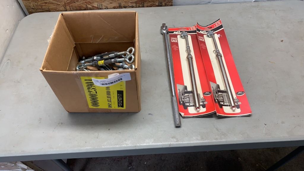 LOT OF NEW TURN BUCKLES, 2 MILTON TIRE GAUGES, AND BREAKER BAR