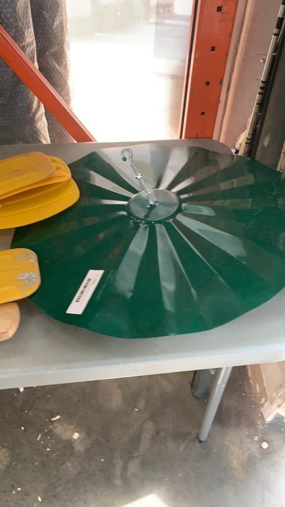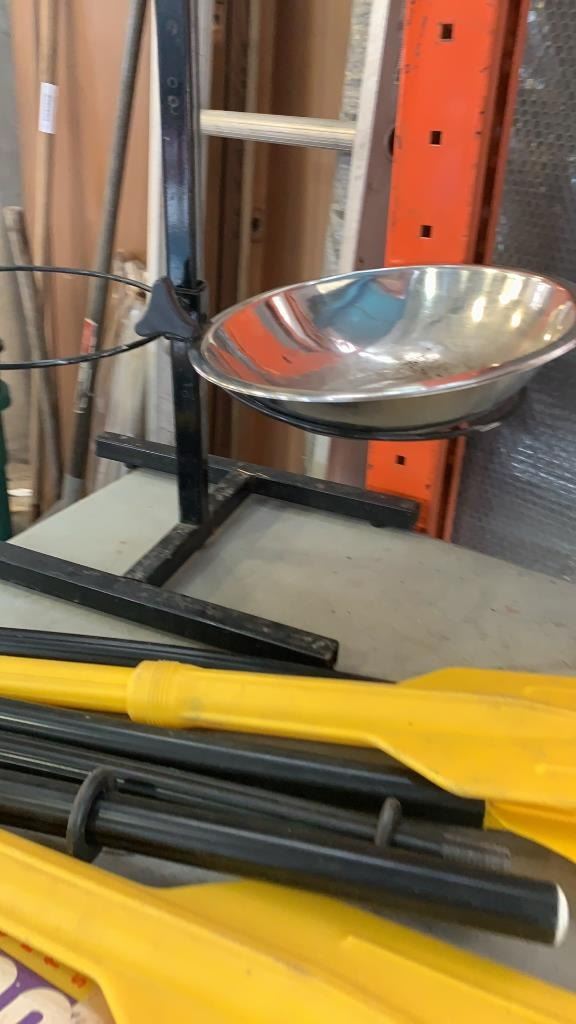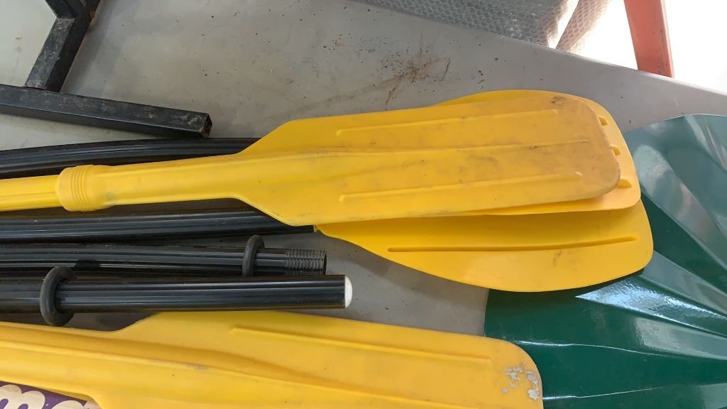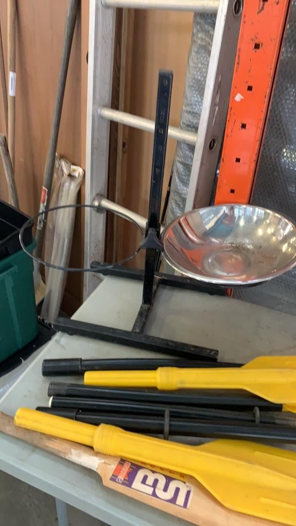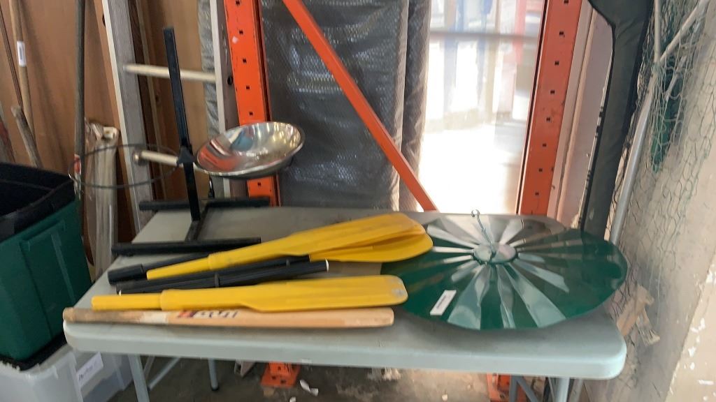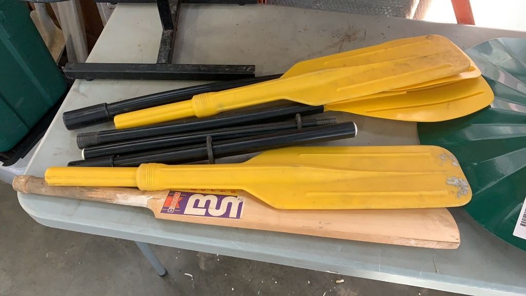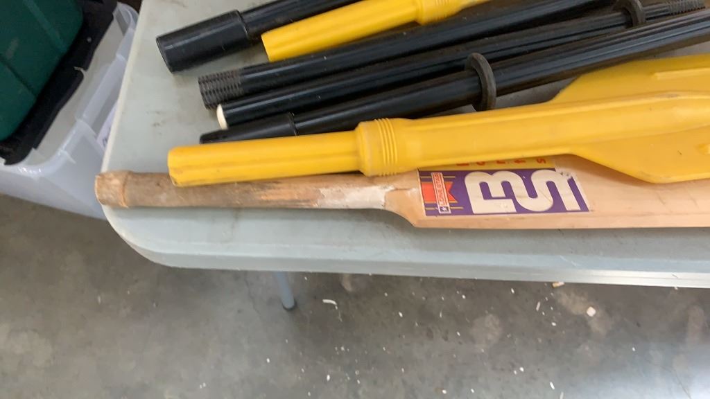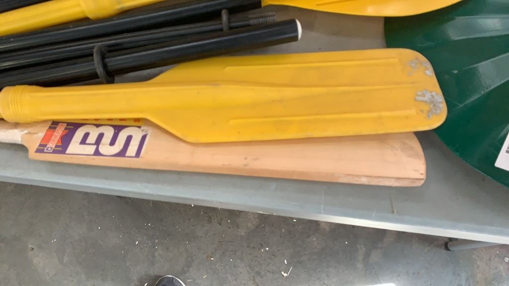 LOT OF PADDLES, CRICKET BAT AND PET FEEDER DISH WITH HOLDER