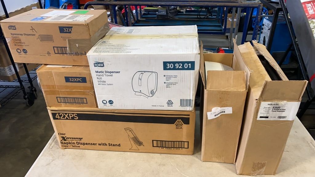 LOT OF PAPER TOWEL DISPENSERS, NAPKIN DISPENSERS, TOILET ROLL DISPENSERS