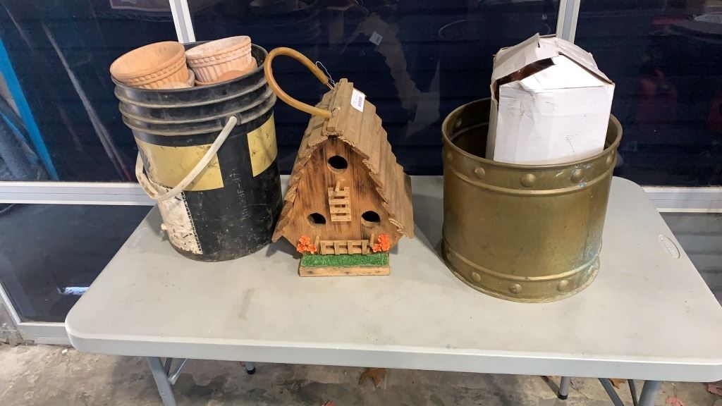 LOT OF PLANT POTS, BRASS BUCKET AND BIRD BNB