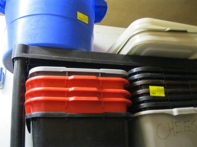 LOT OF PLASTIC BUS PANS AND A LARGE BLUE PLASTIC TUB