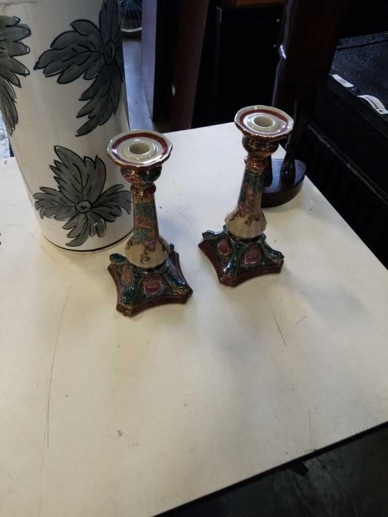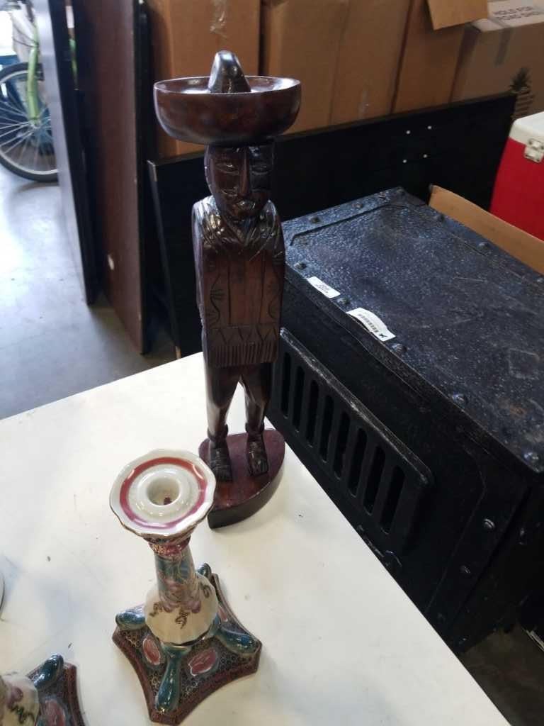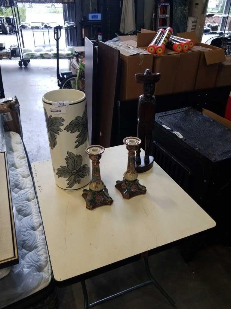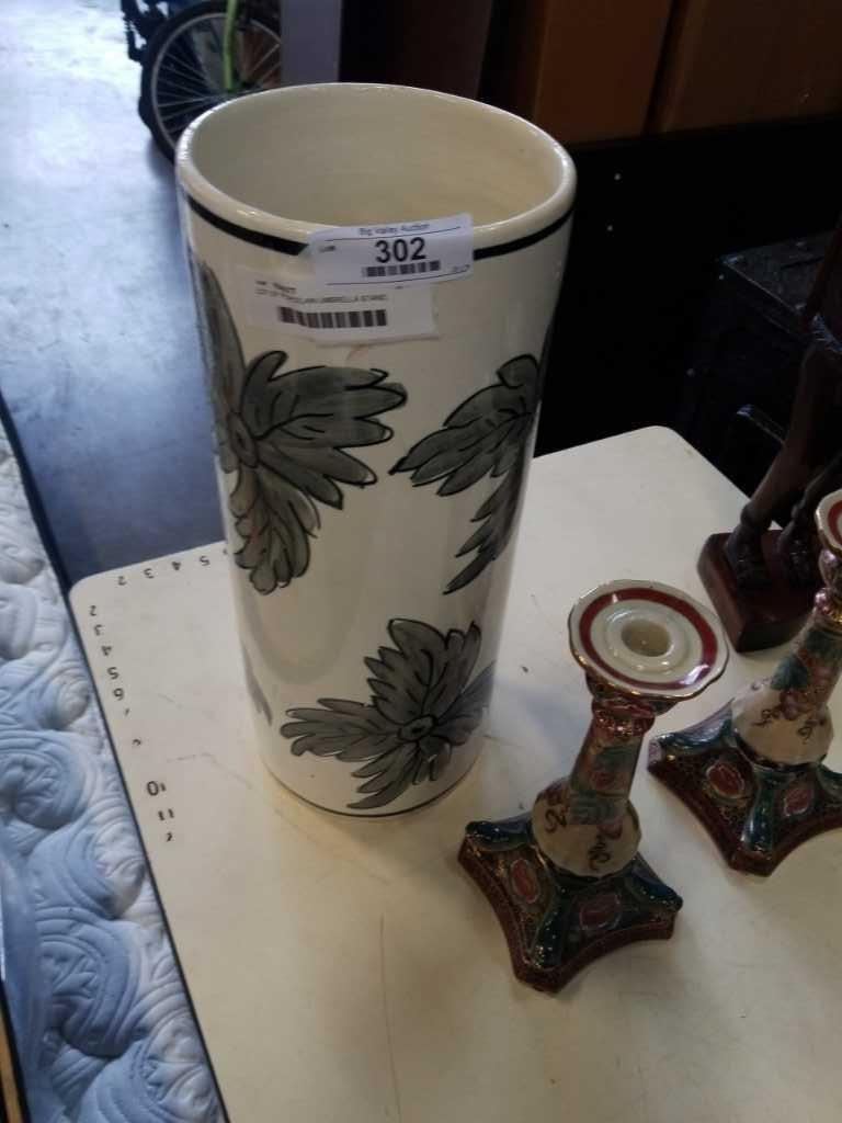 LOT OF PORCELAIN UMBRELLA STAND, CANDLEHOLDERS AND CARVED WOODEN FIGURE