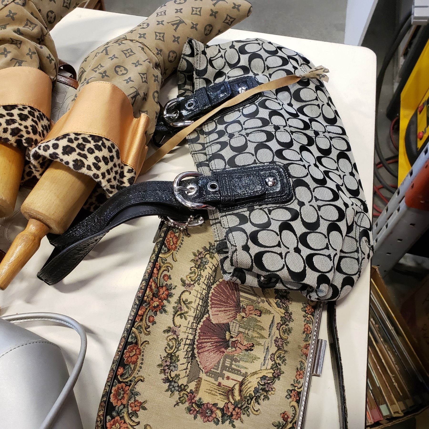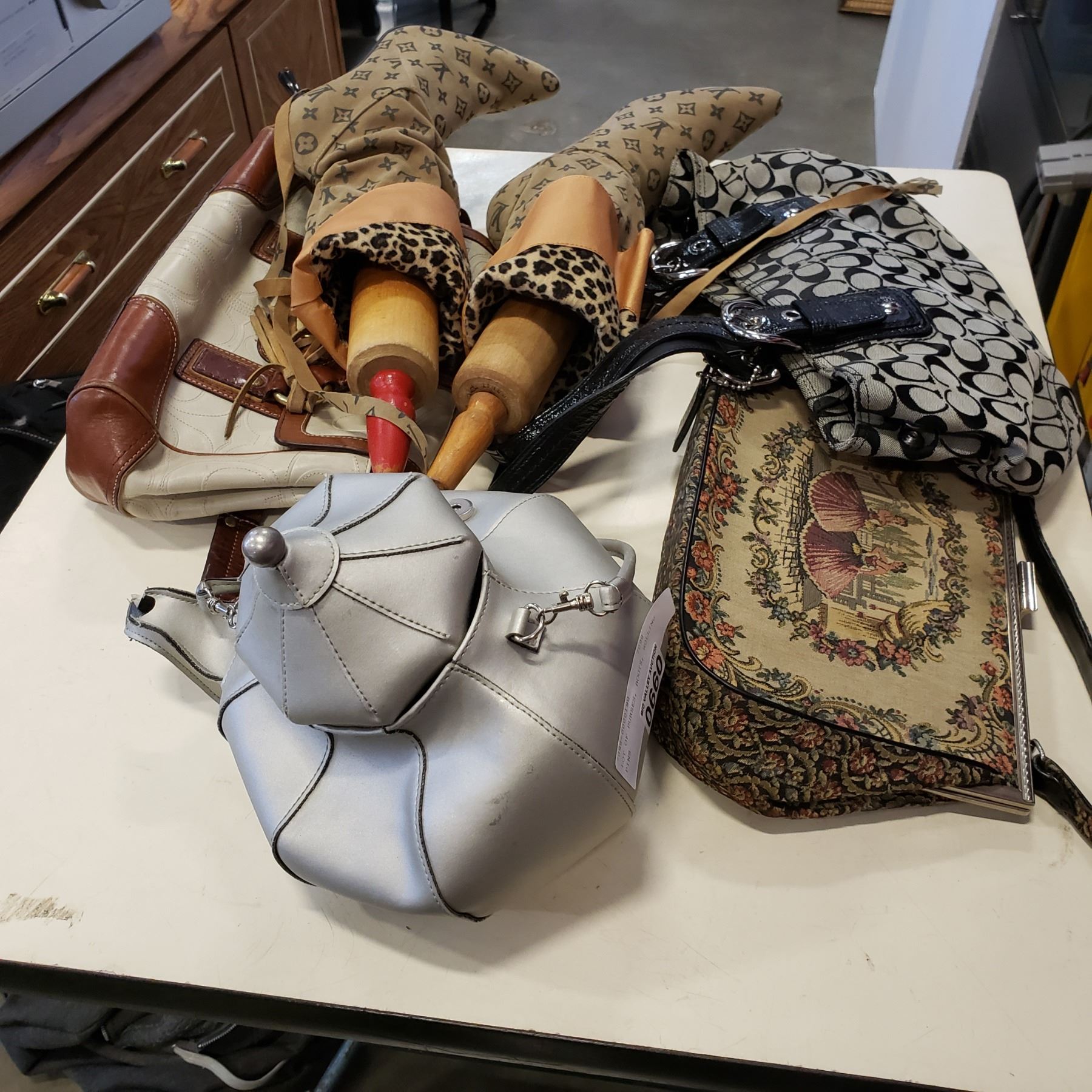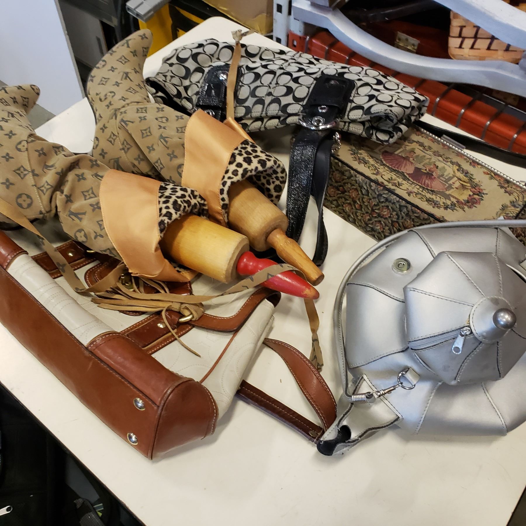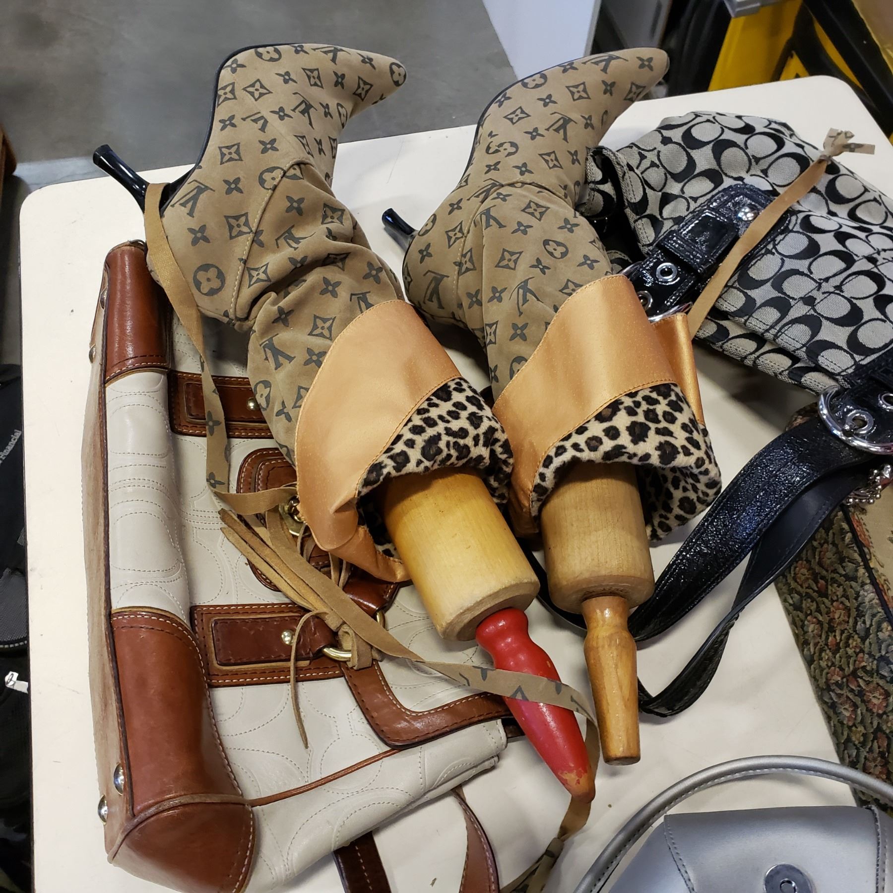 LOT OF PURSES, BOOTS, ROLLING PINS