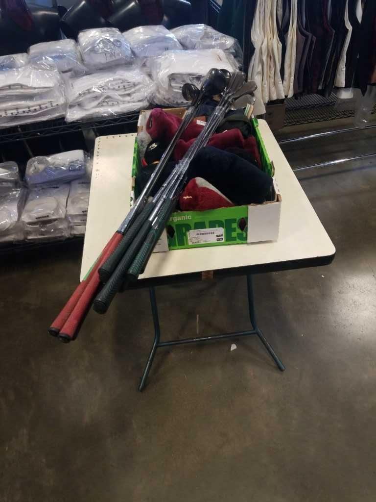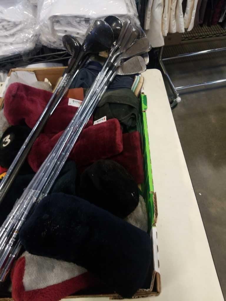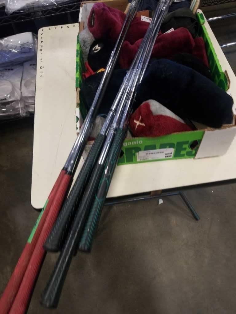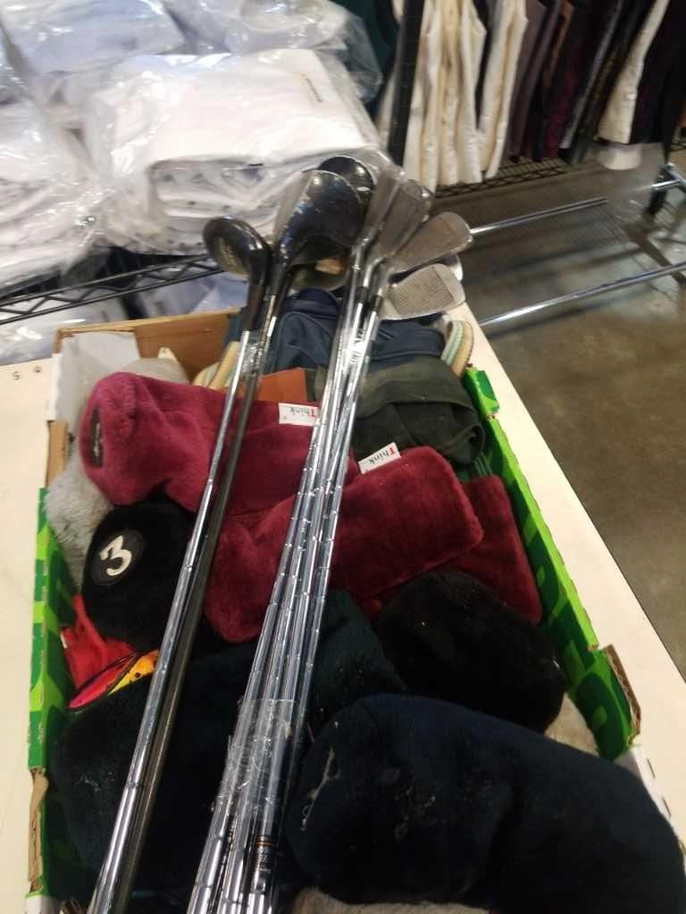 LOT OF RH GOLF CLUBS AND BOX OF CLUB HEAD COVERS