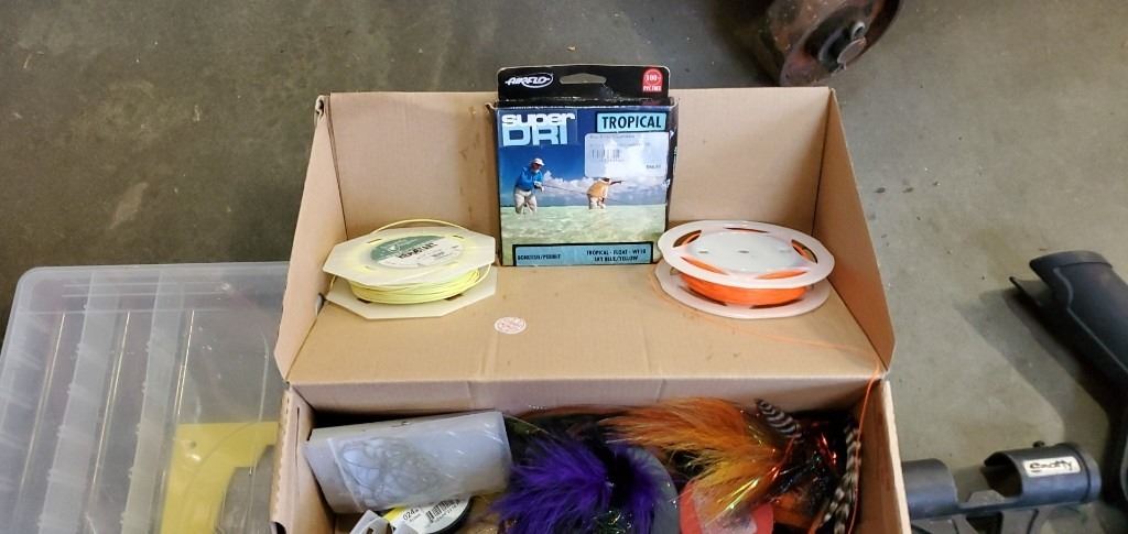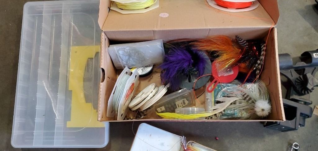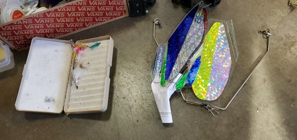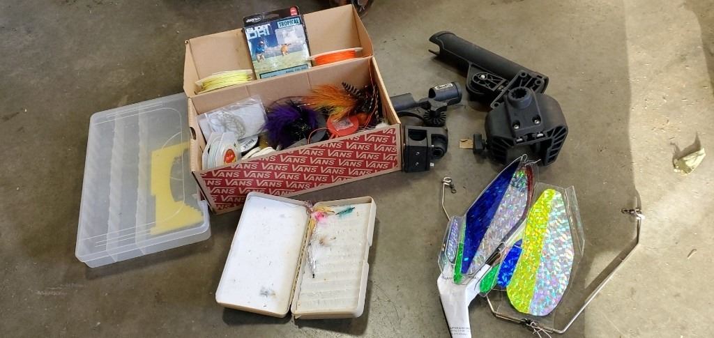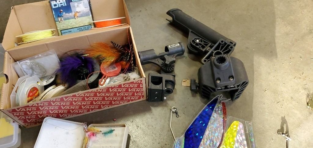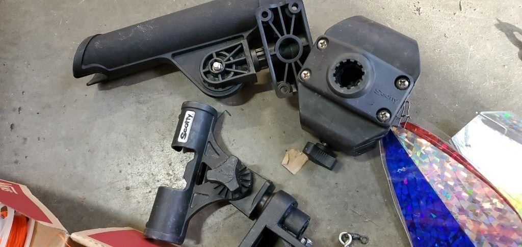 LOT OF SCOTTY ROD HOLDERS, MOUNTS, BOX OF TACKLE, LINE, LARGE FLASHERS, ORGANIZERS ETC