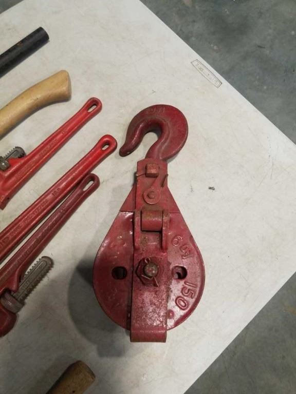 LOT OF SLEDGE HAMMERS, SAWS, PIPE WRENCHES, BLOCK AND TACKLE PULLEY WITH HOOK
