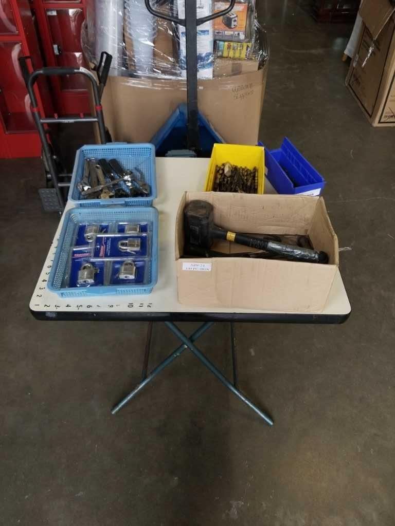LOT OF SREWDRIVER BITS, HAMMERS, DRILL BITS, WRENCHES AND MORE