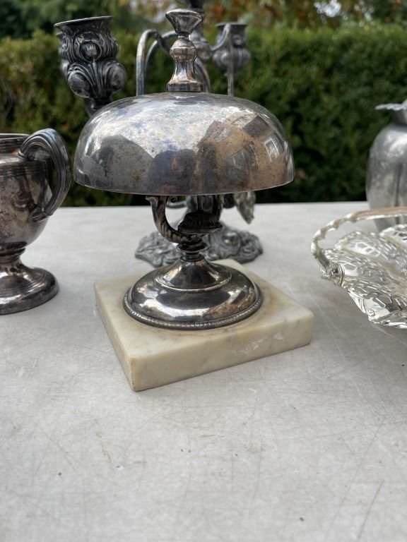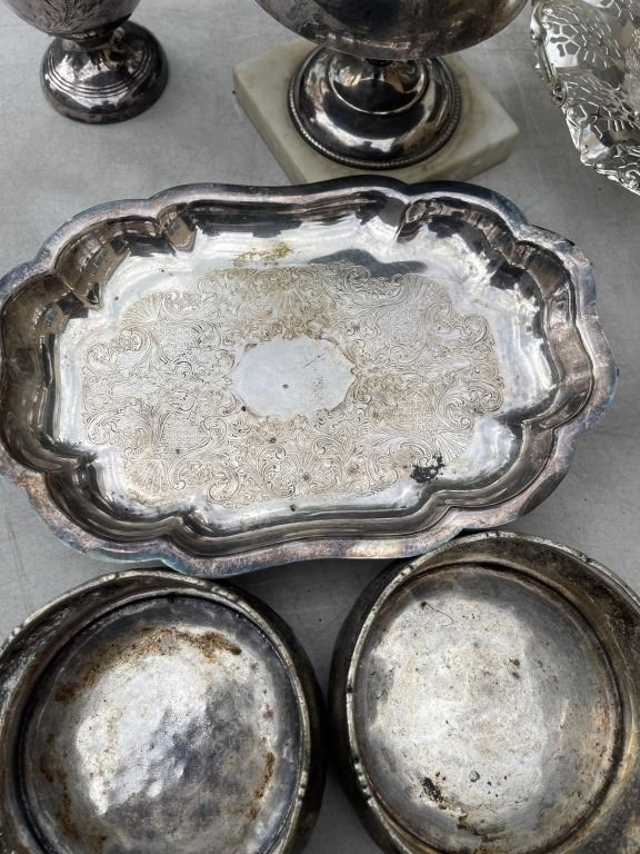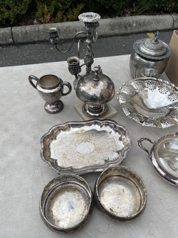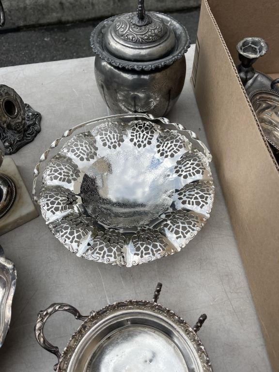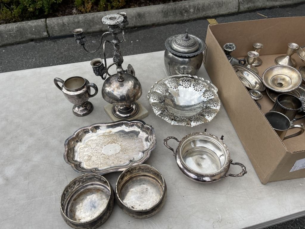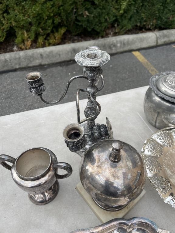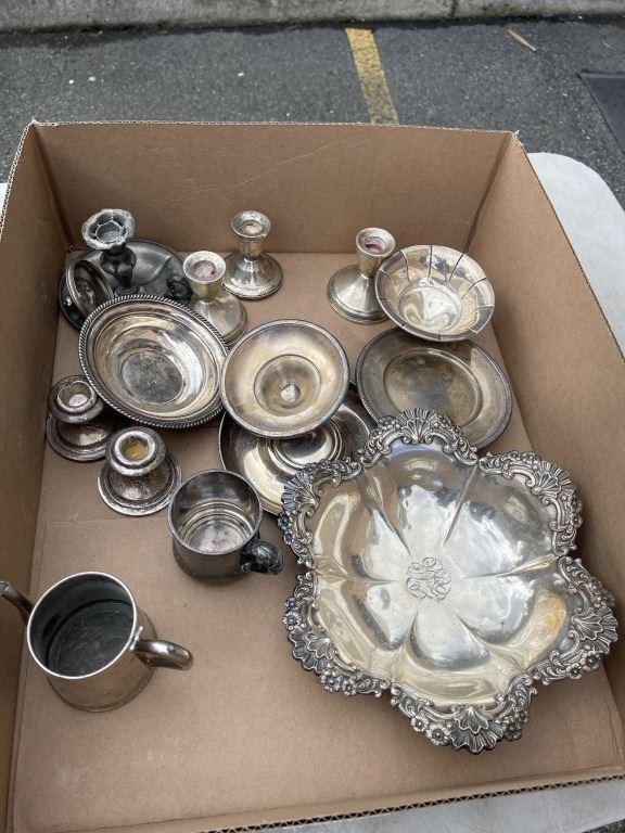 LOT OF STERLING AND PLATED SILVER SERVING DISHES, CANDLE HOLDERS AND MORE