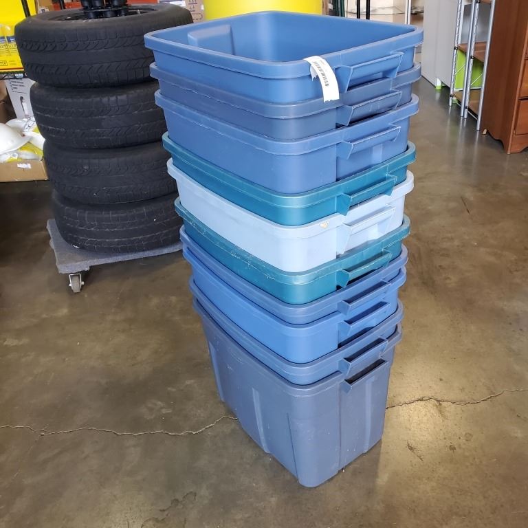LOT OF TEN RUBBERMAID TOTES, NO LIDS