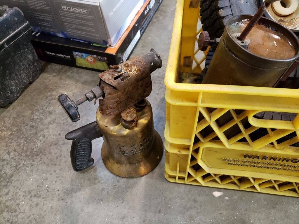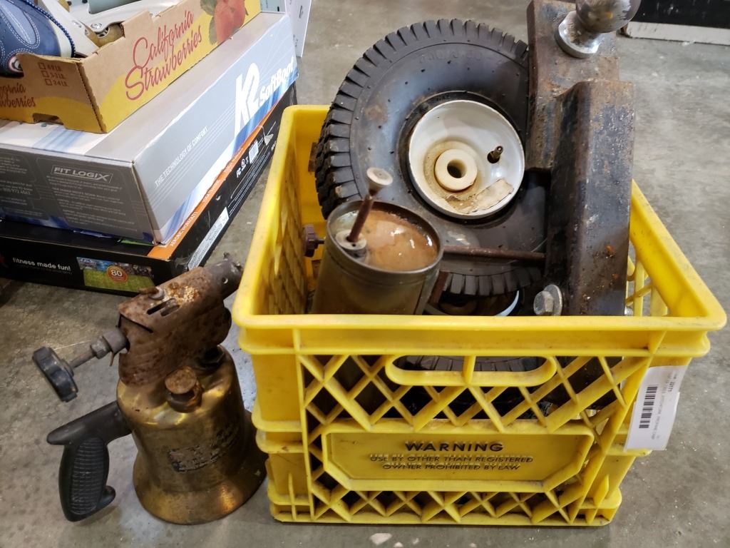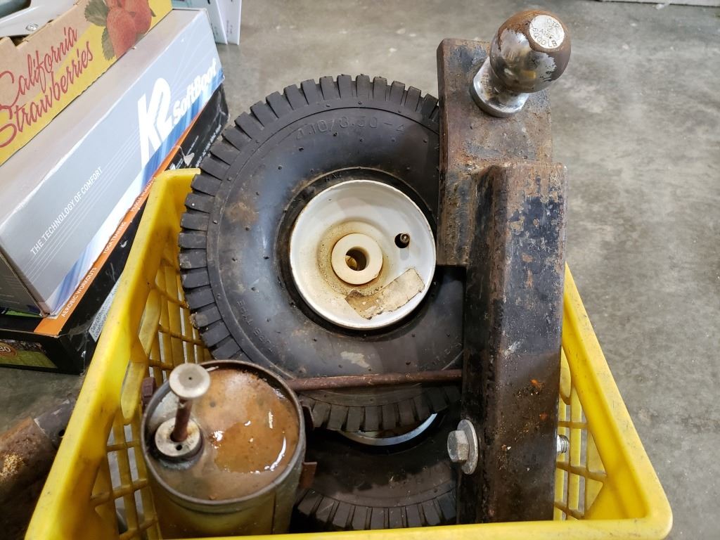 LOT OF TIRES, PITCHFORK, KEROSENE CAMP STOVE TANK