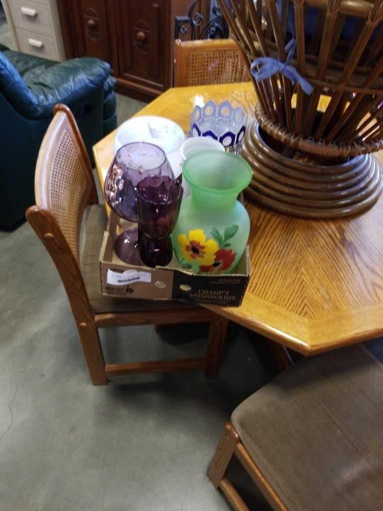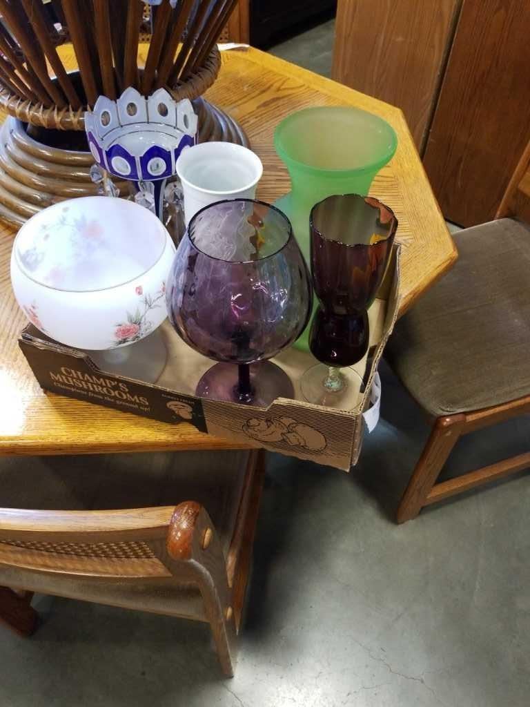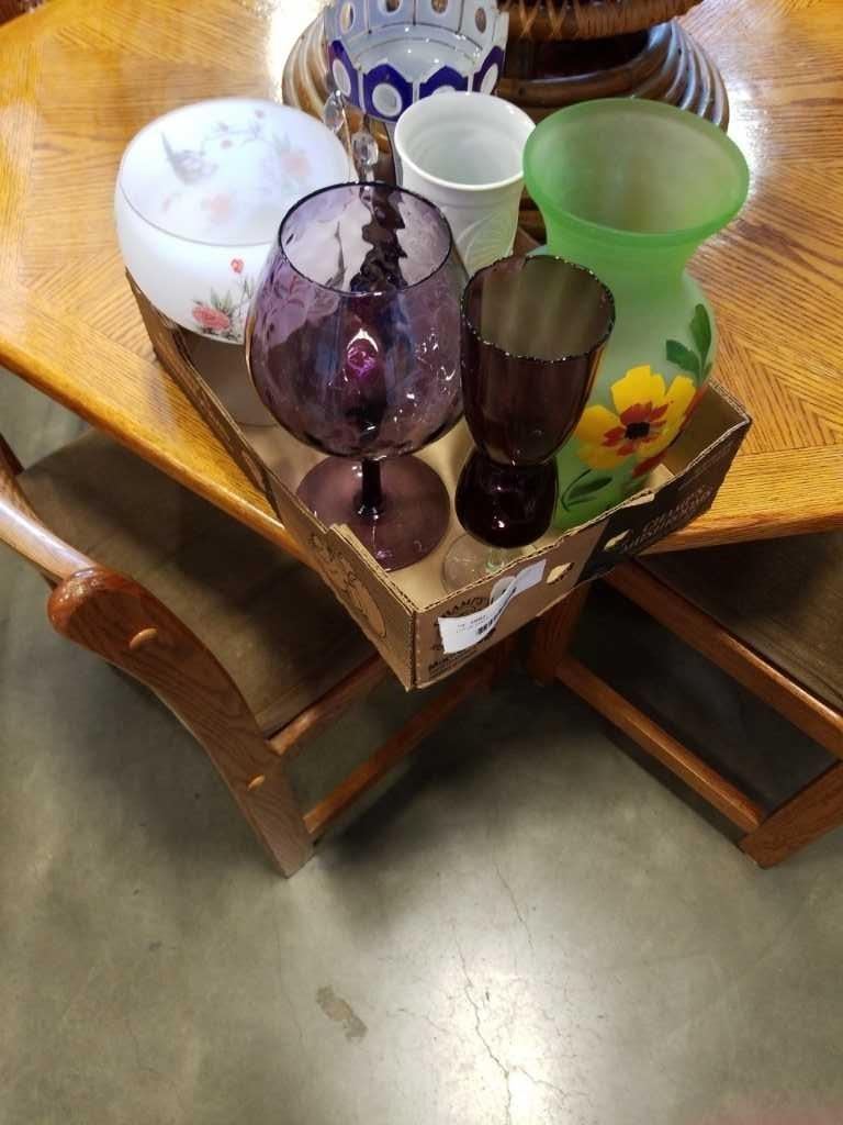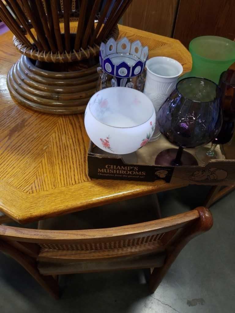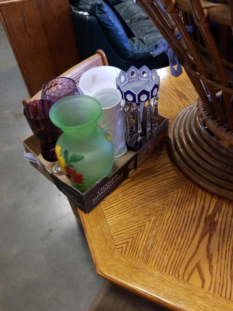 LOT OF VASES, CUT TO CLEAR VASE WITH PENDANTS, HAND PAINTED AND OTHERS