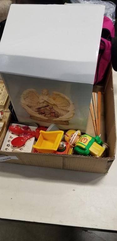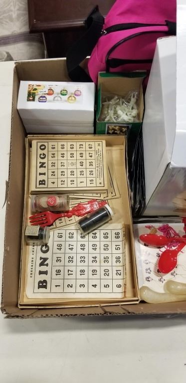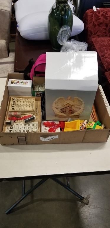 LOT OF VINTAGE COLLECTIBLES, BINGO SETS, LIGHT UP ANGEL, TOYS, KNIVES ETC