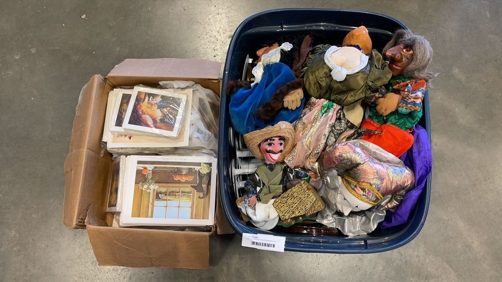LOT OF VINTAGE DOLLS, MARIONETTES, ETC AND TOTE OF DOLL STANDS