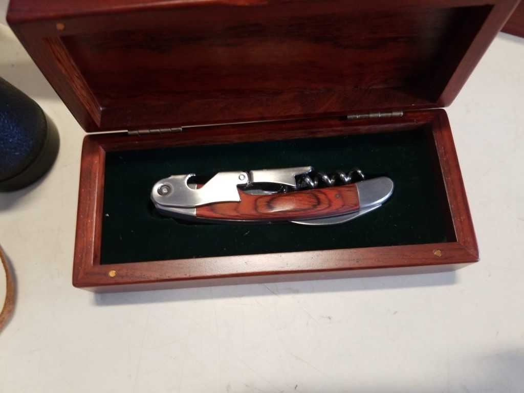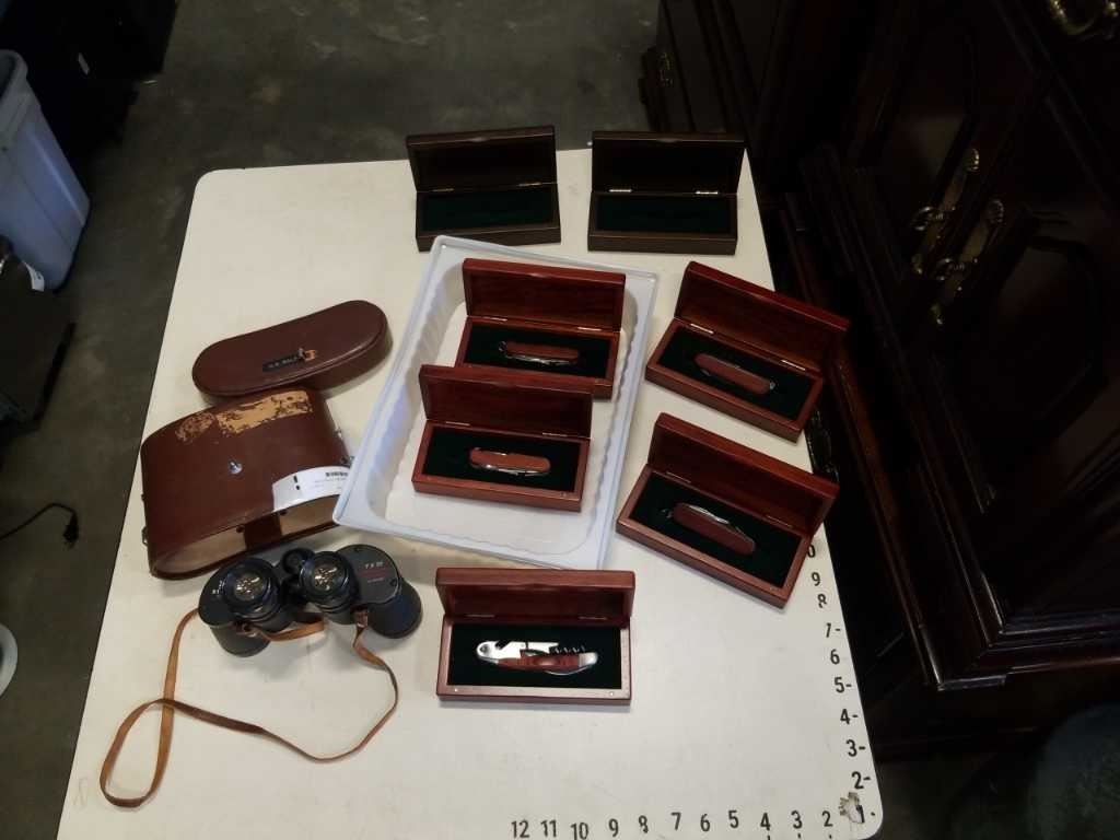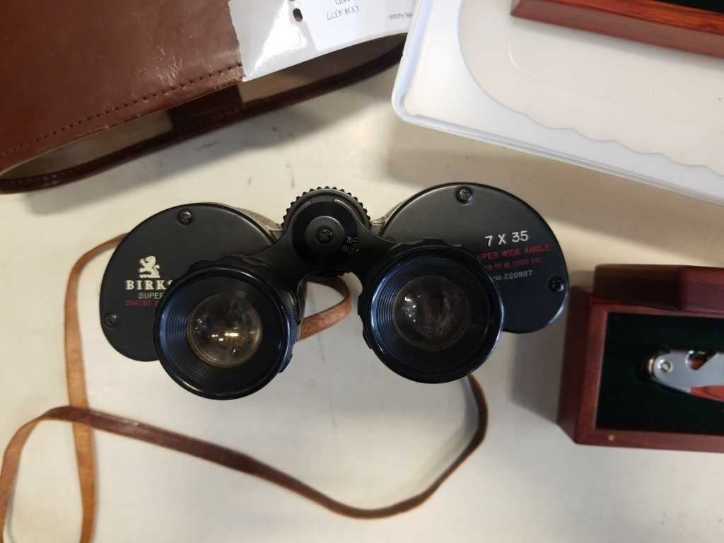 LOT OF WINE CORKSCREWS MULTITOOLS AND POCKET KNIVES IN CASES AND BIRKS 7 X 35 BINOCULARS