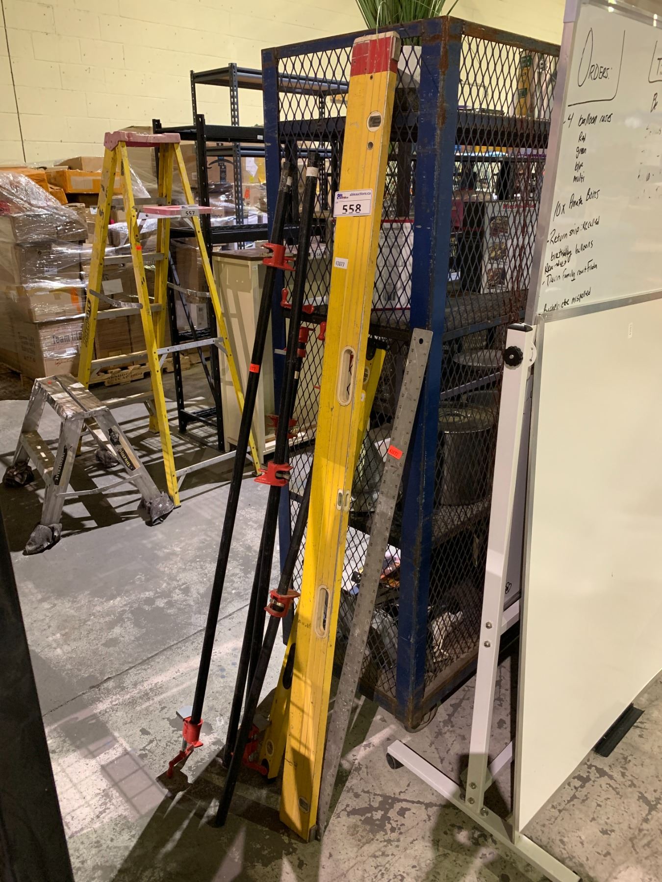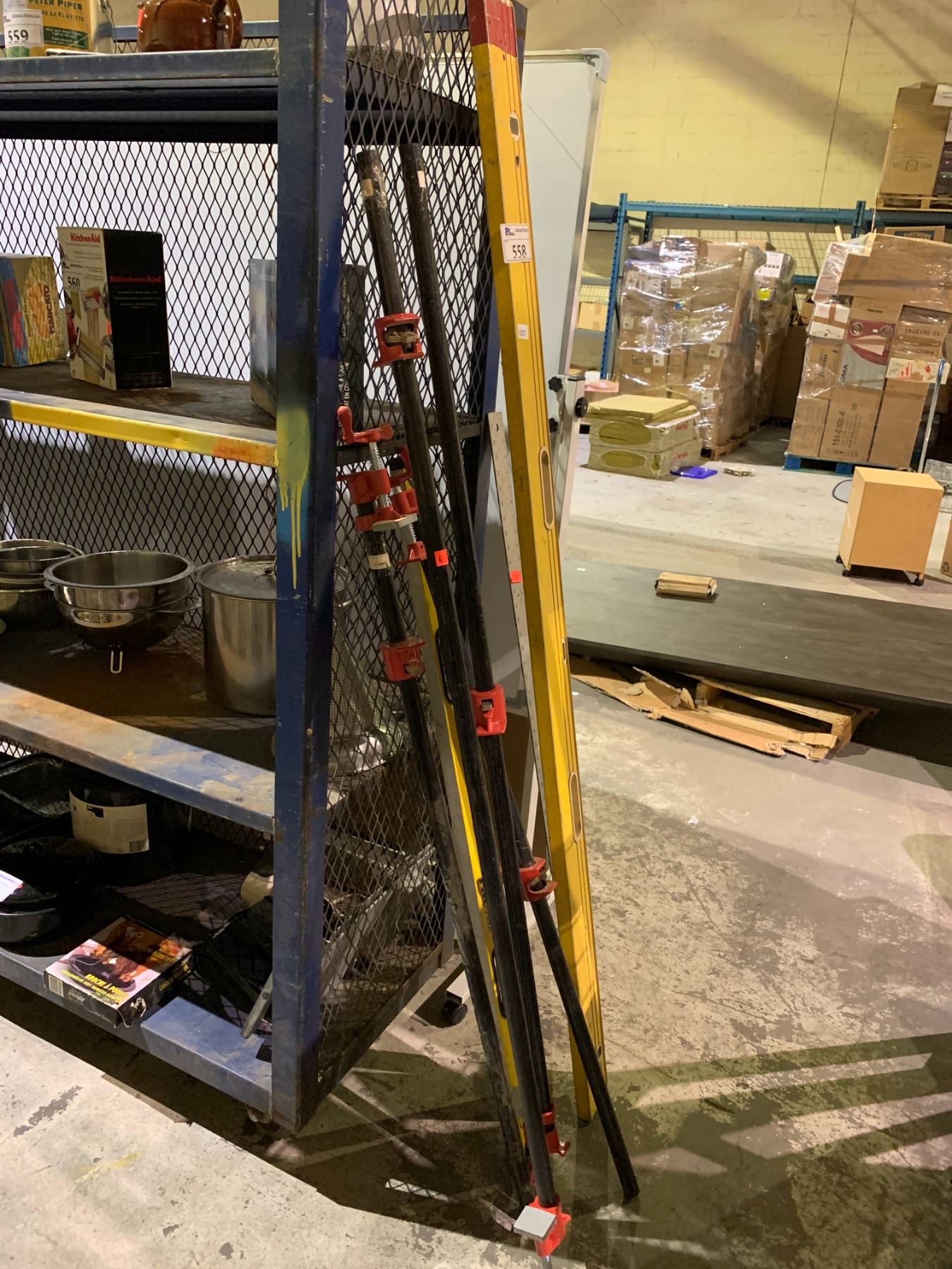 LOT OF WOOD BAR CLAMPS, MEASURING STICK AND 2 LEVELS