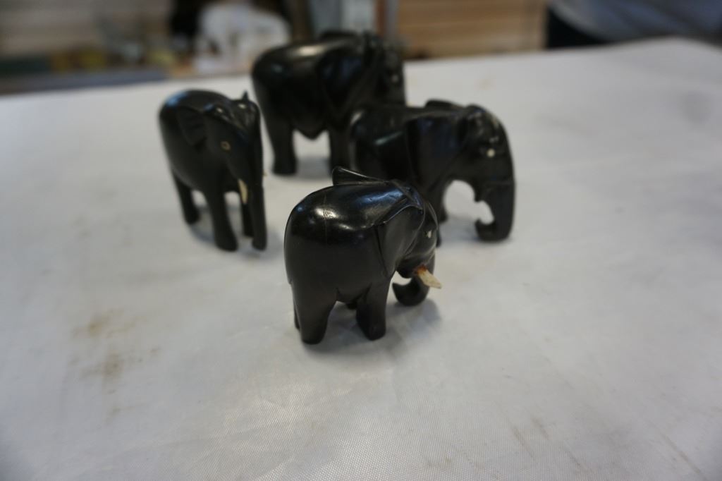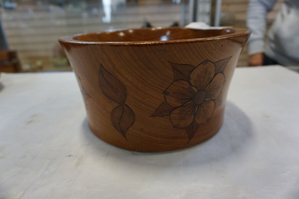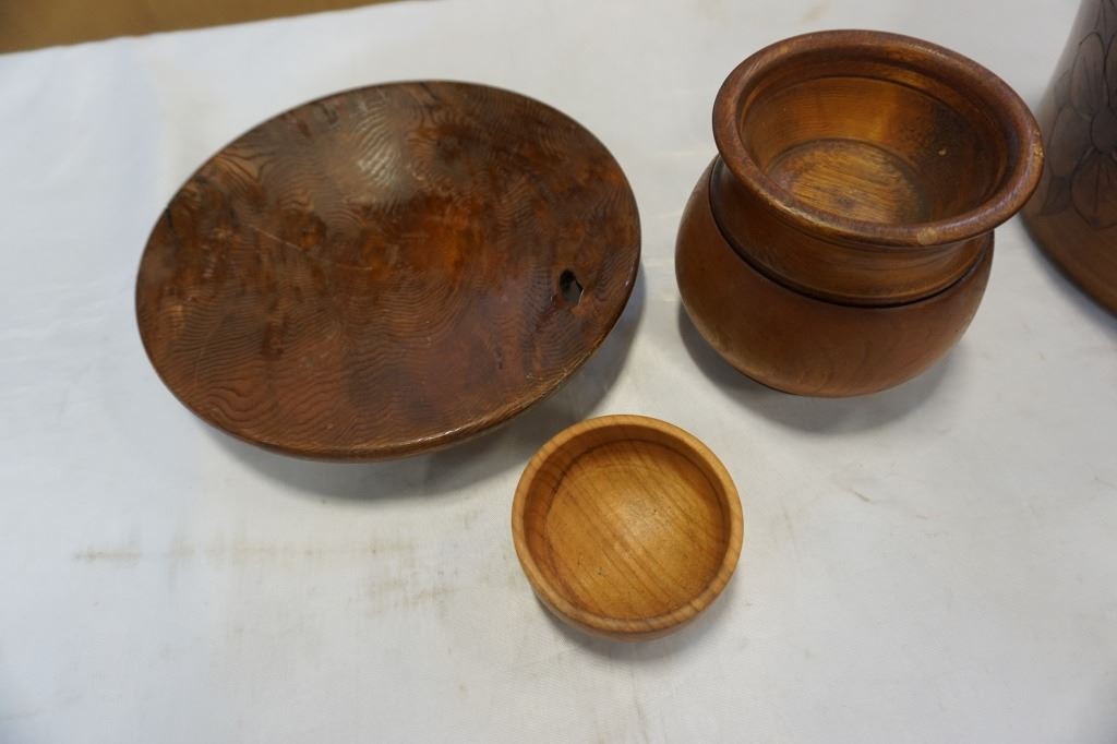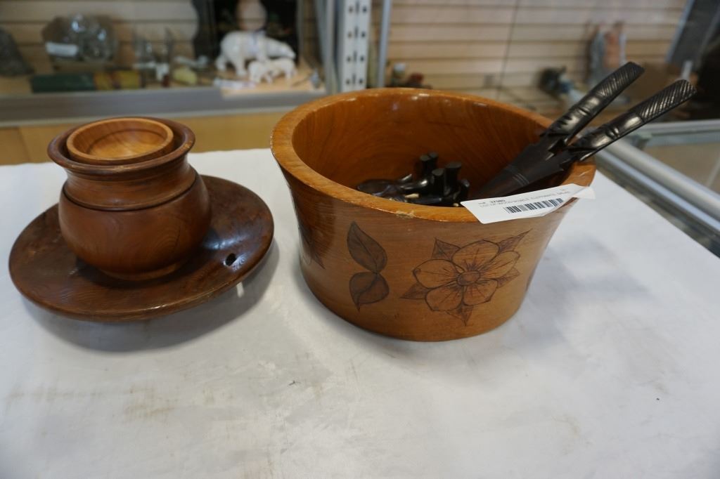 LOT OF WOOD BOWLS, ELEPHANTS, SALAD UTENSILS