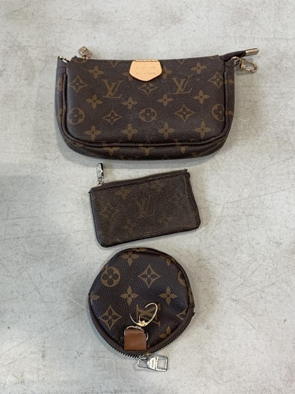 "LV" ZIPPERED HAND BAG AND 2 CHANGE PURSES, AUTHENTICITY UNKNOWN