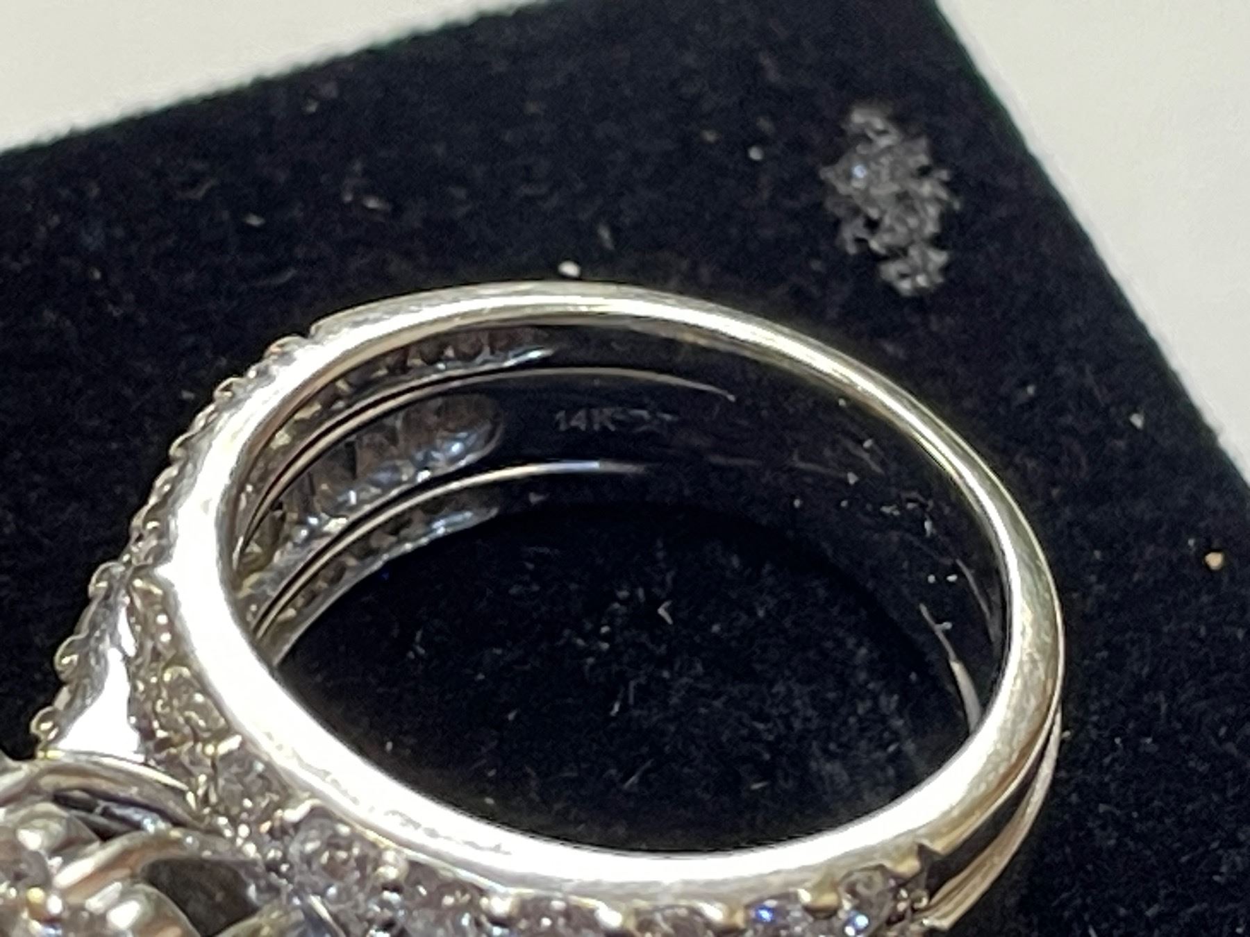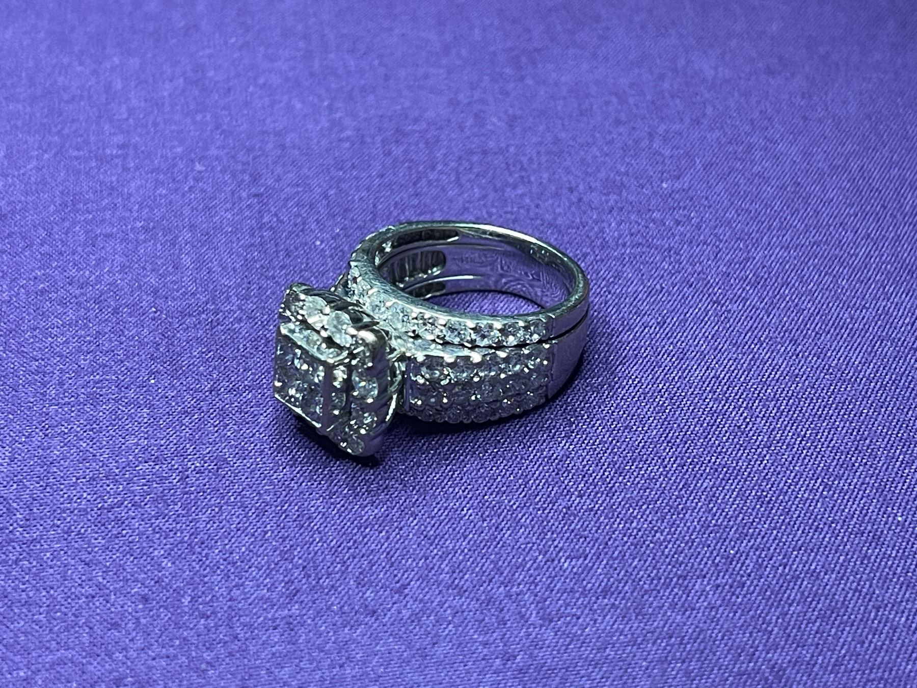 One lady's 14kt white gold diamond engagement ring and two set wedding bands. All three . the set measures 6.6mm to 11mm in width. The ring is crowned with a raised setting. A central square bezel frame is set with four cut diamonds. The frame of prong setting secures twelve round brilliant cut diamond. The shoulders of the ring are accented with twenty round brilliant diamonds. The two bands are each prong set with a row of thirteen round brilliant . For more details check out the replacement cost document.