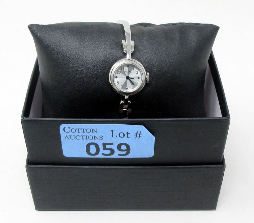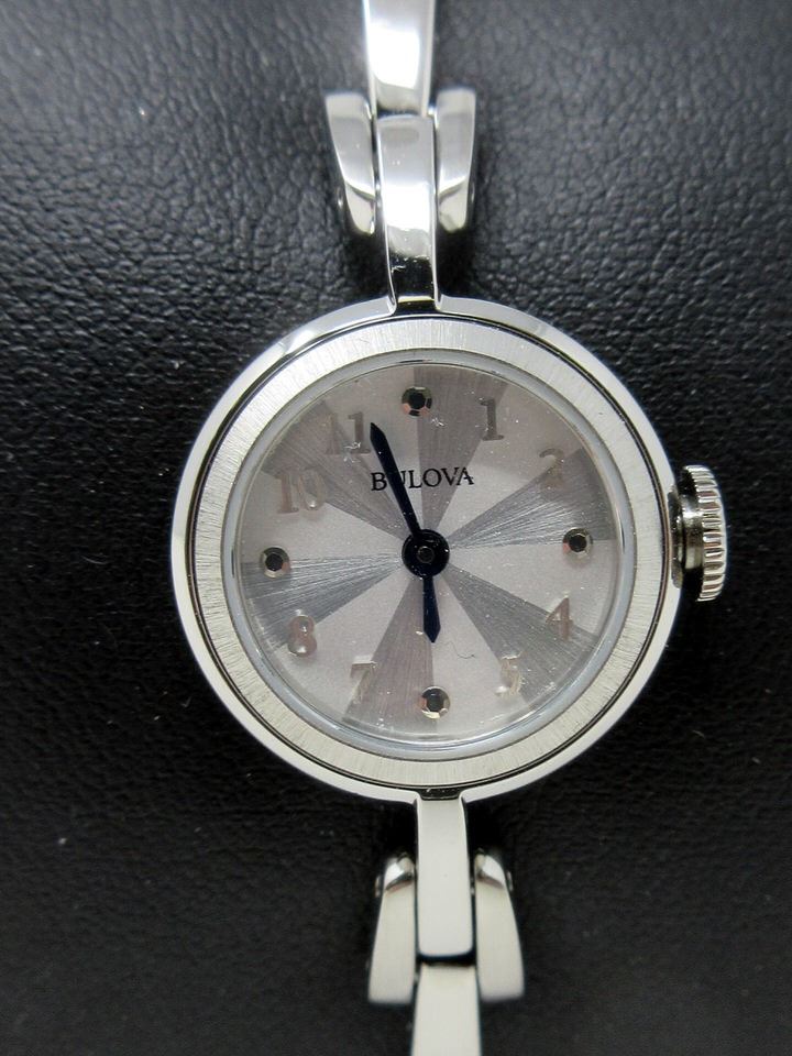 Model: 96L222. 20 mm stainless steel case on a slender band. Blue hands. In box with warranty and instruction booklet.