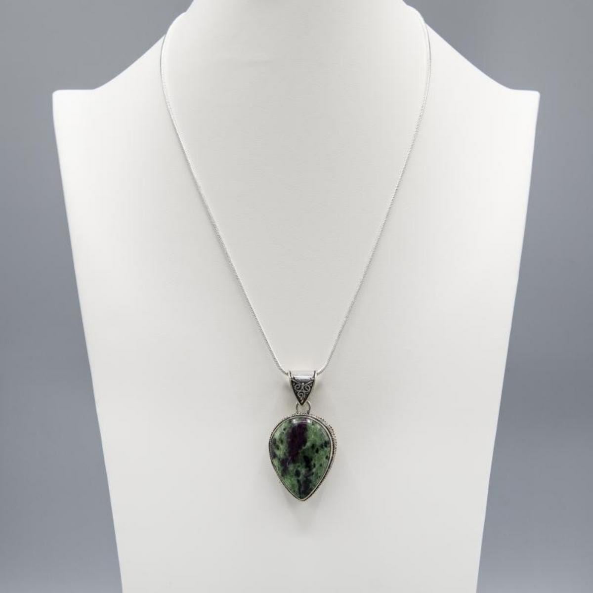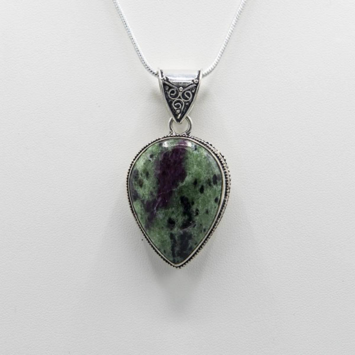 Ladies Natural 53.5 Ct Ruby Zoisite Pendant.Featuring a bezel set pear shaped polished ruby zoisite weighing set in a .925 sterling silver overlay.Pendant includes 20" chain.The total gram weight is 26 grams.Untreated.