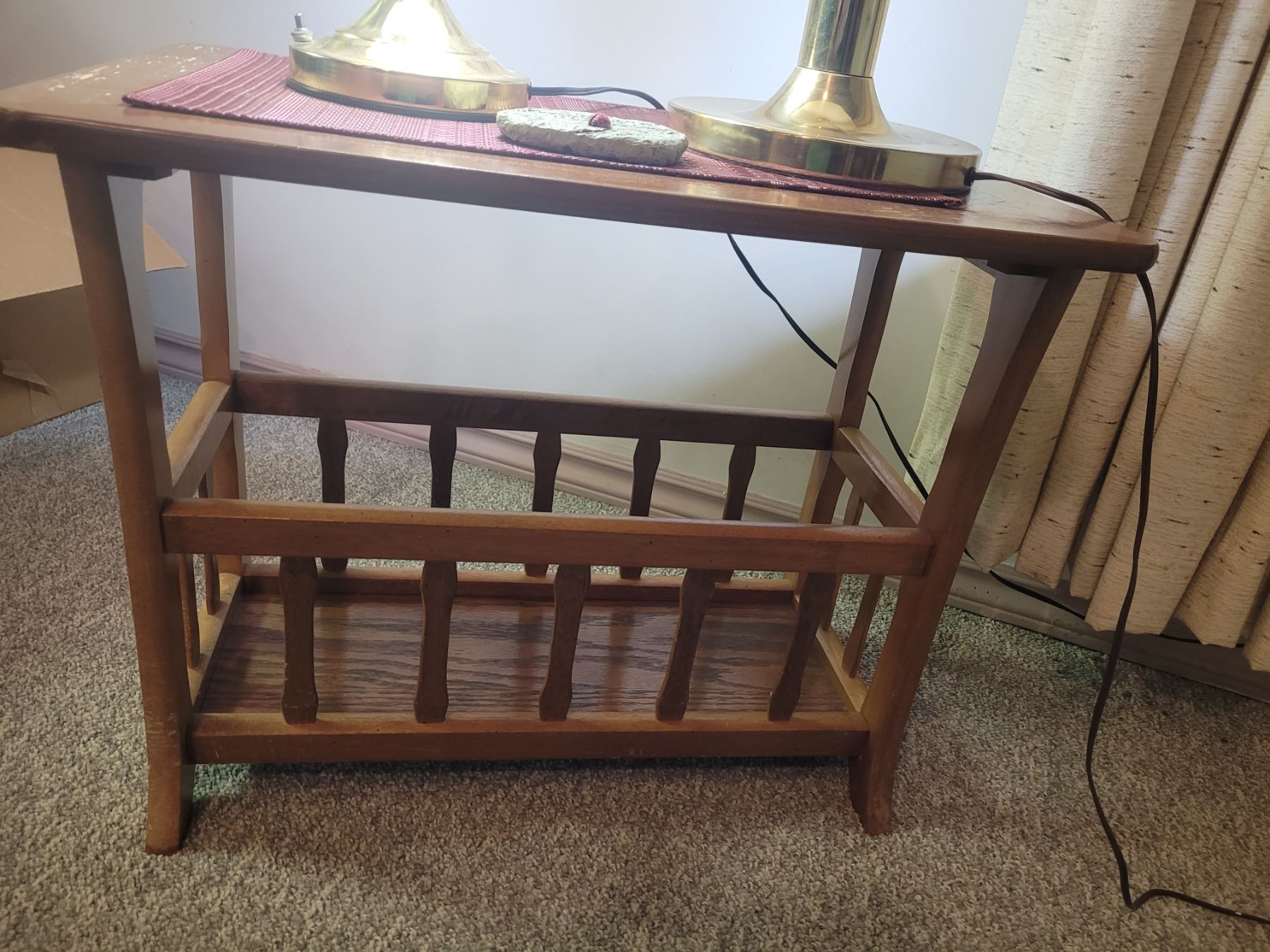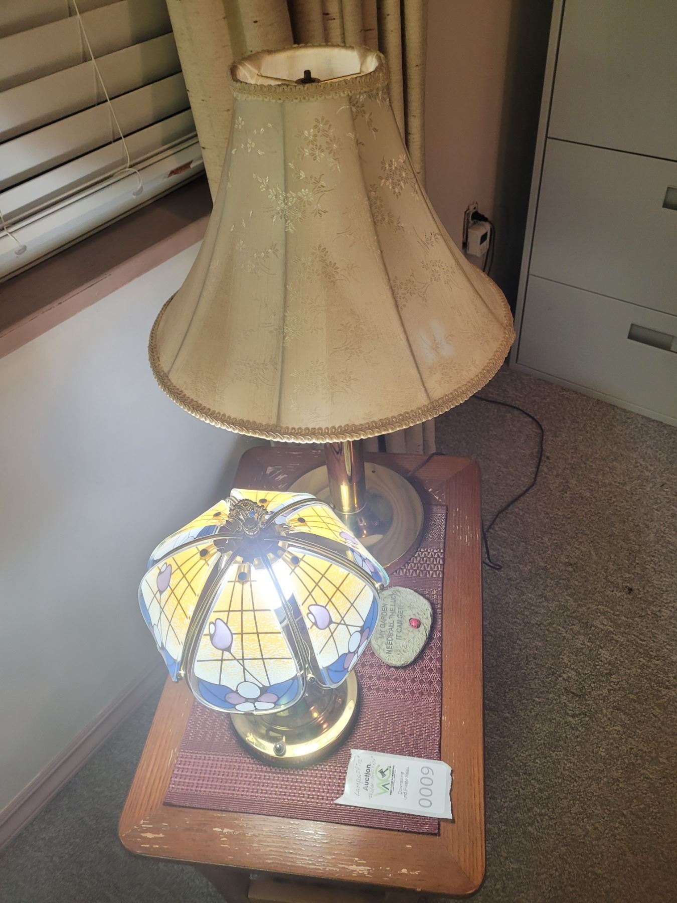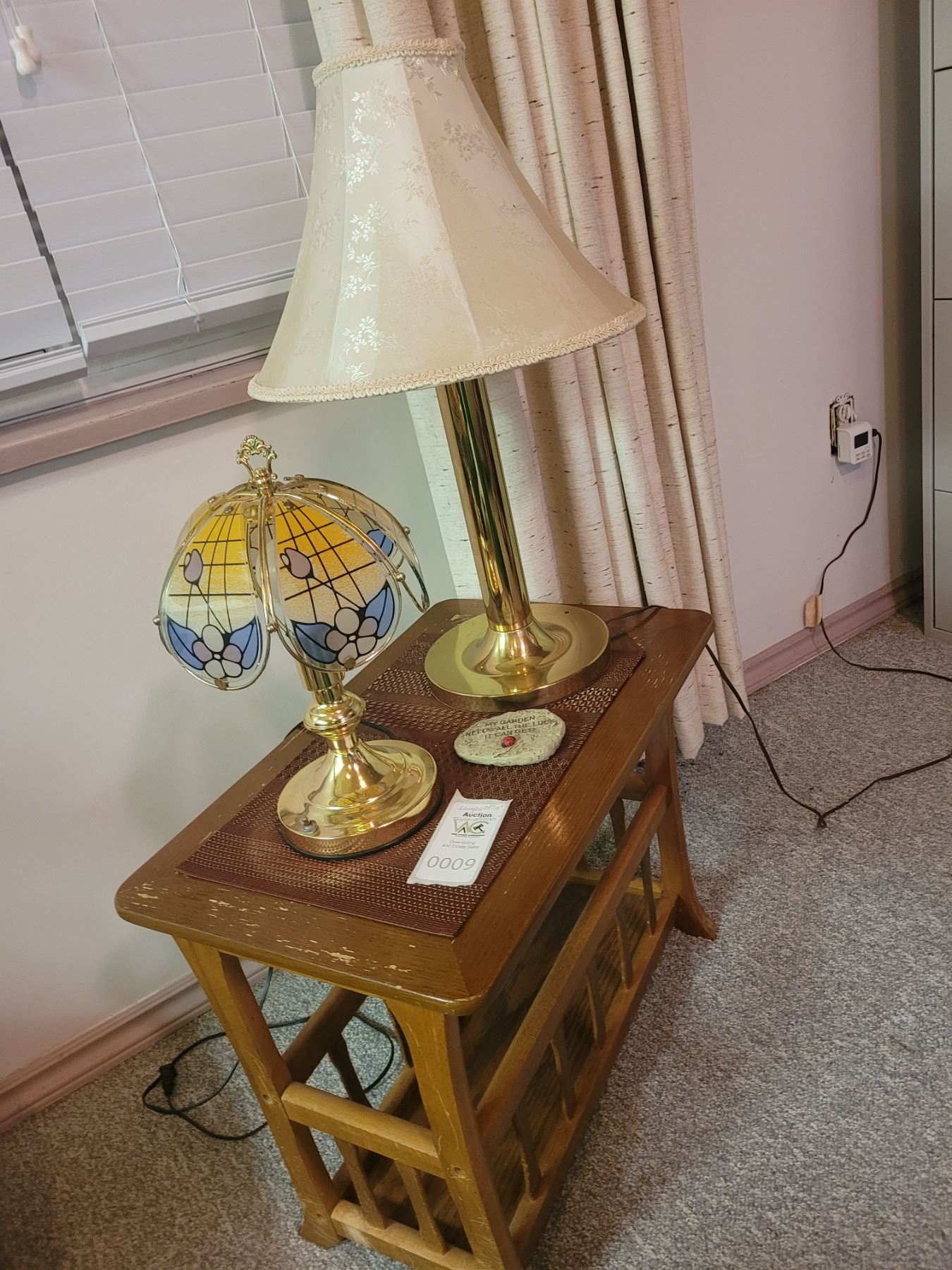 Pair of table lamps and side table, note scratches, pickup at 10. Am