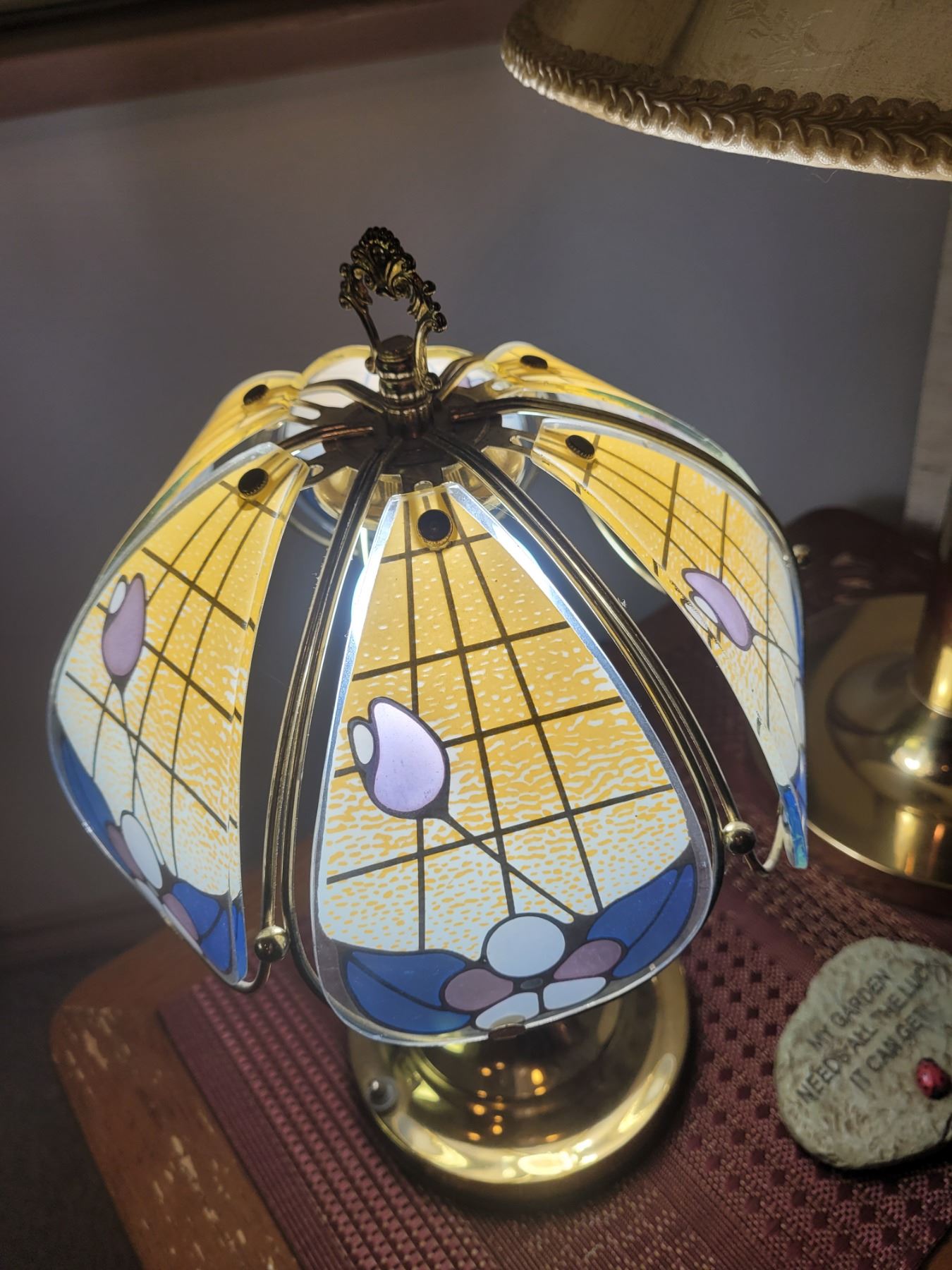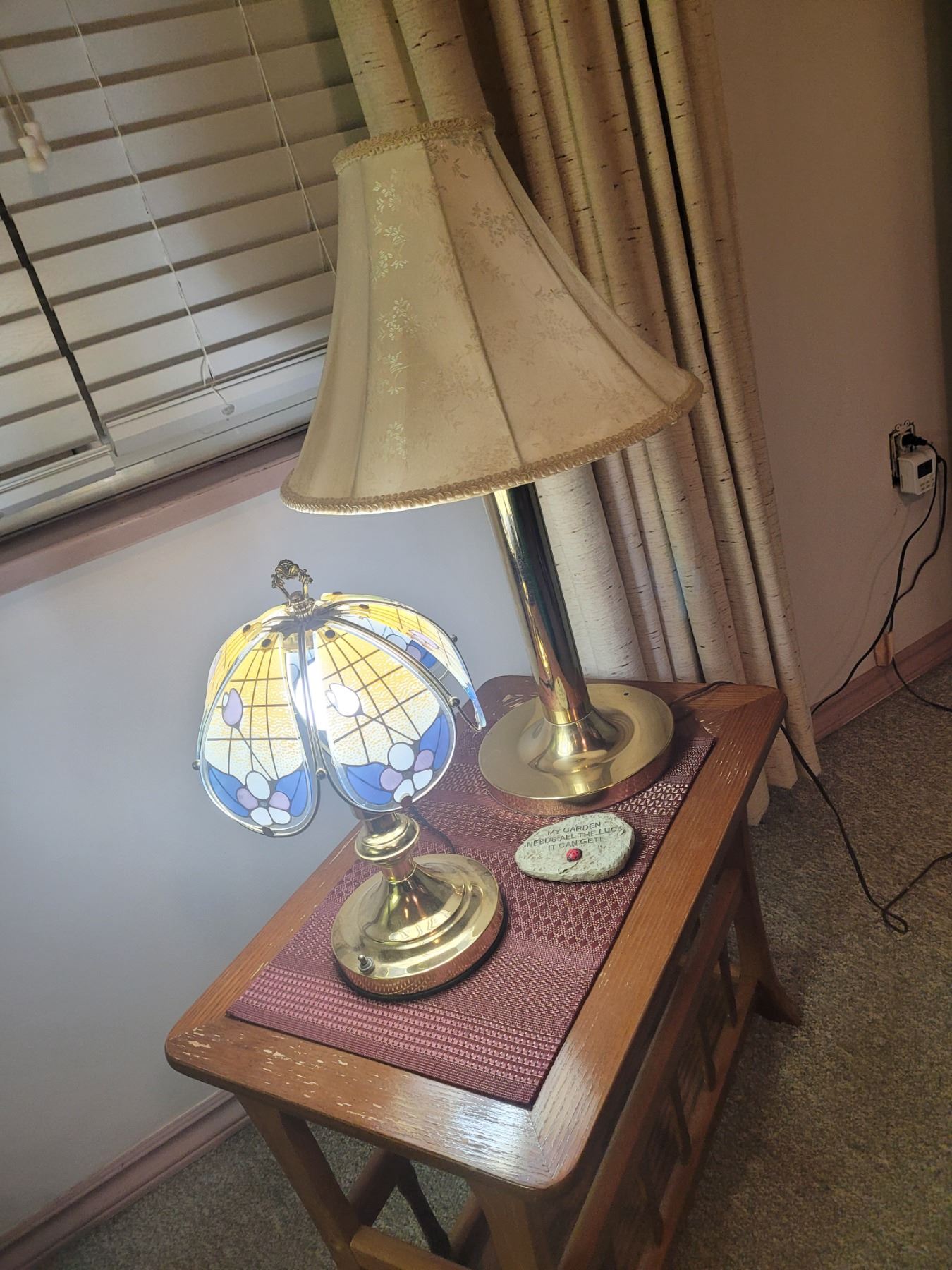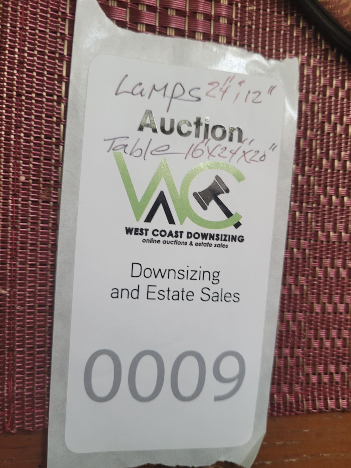 Pair of table lamps and side table, note scratches, pickup at 10. Am