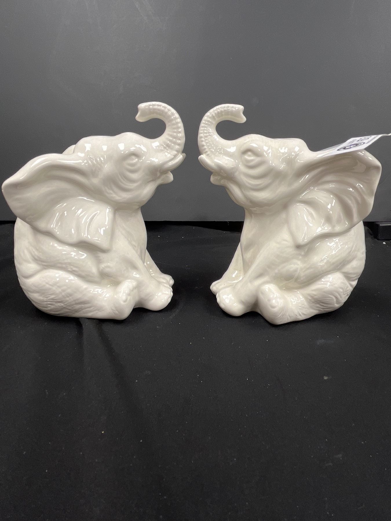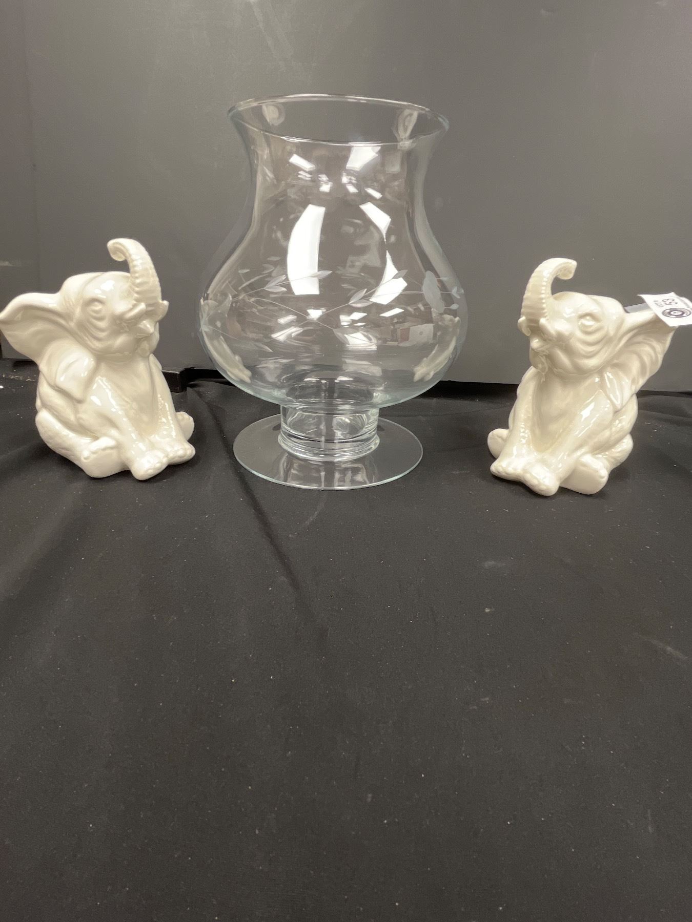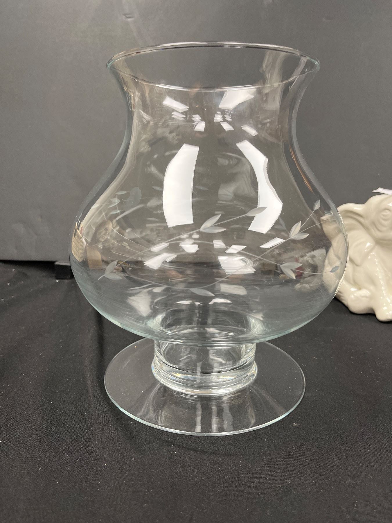 Large 10" T Vintage Etched Glass Footed Vase & Ceramic Elephants