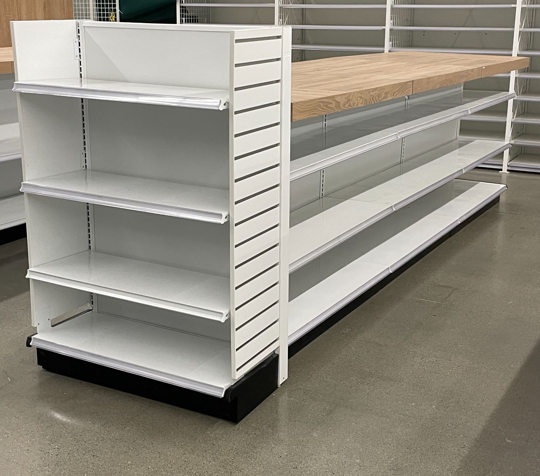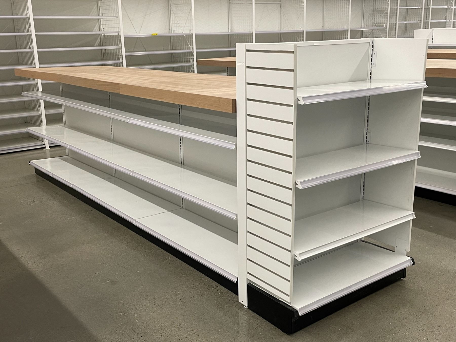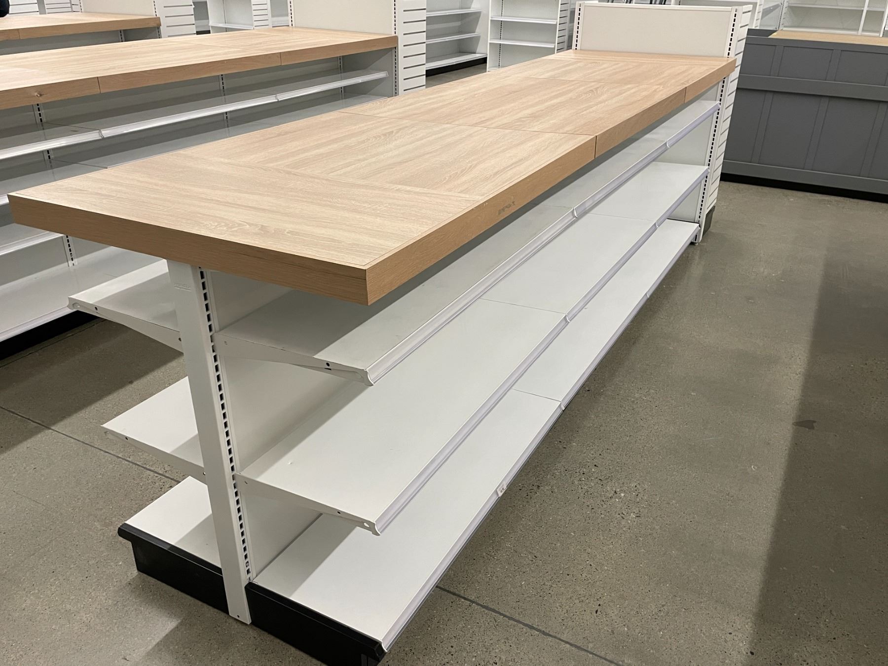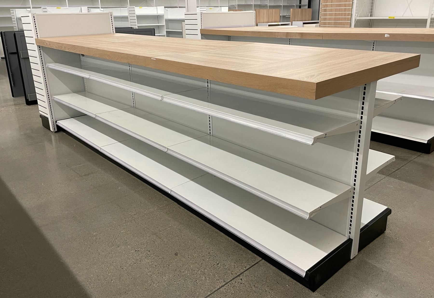 Large 3 tier retail double-sided with large wooden table top & single end cap (approx. 153in W 51 1/2in 55in H 40in D - excellent condition - Madix brand) BIDDERS ARE RESPONSIBLE FOR ALL COSTS ASSOCIATED WITH PICKUP OF THEIR LOTS INCLUDING BUT NOT LIMITED TO RENTAL OF EQUIPMENT, FORKLIFTS, LABOUR, TRUCKING, TOOLS ETC.