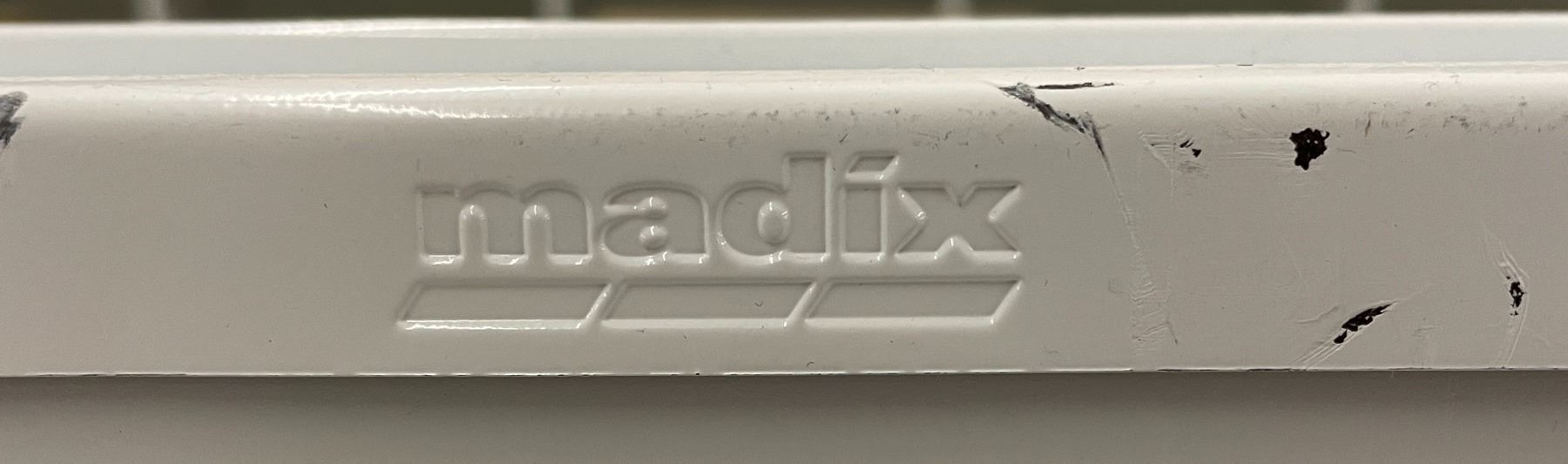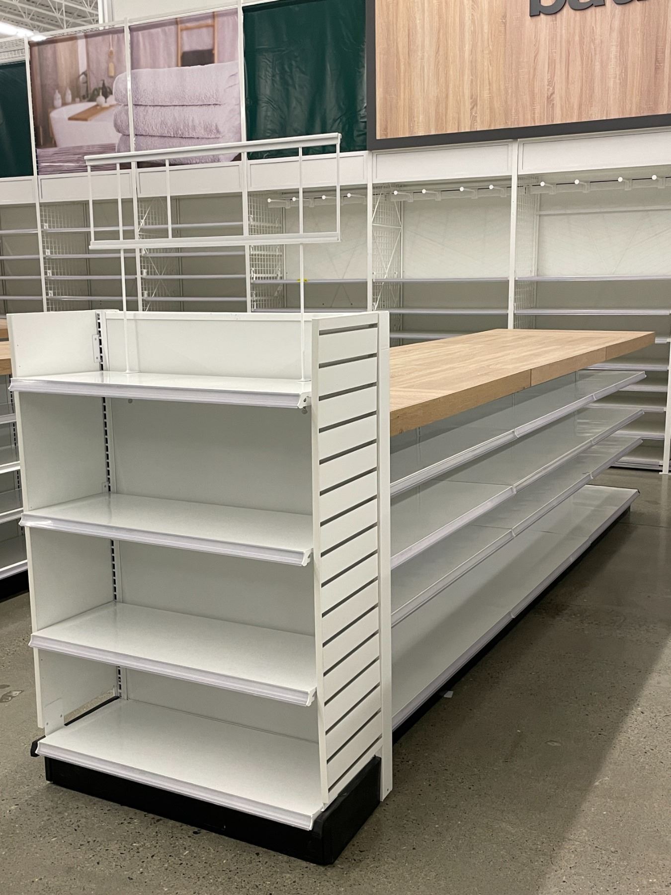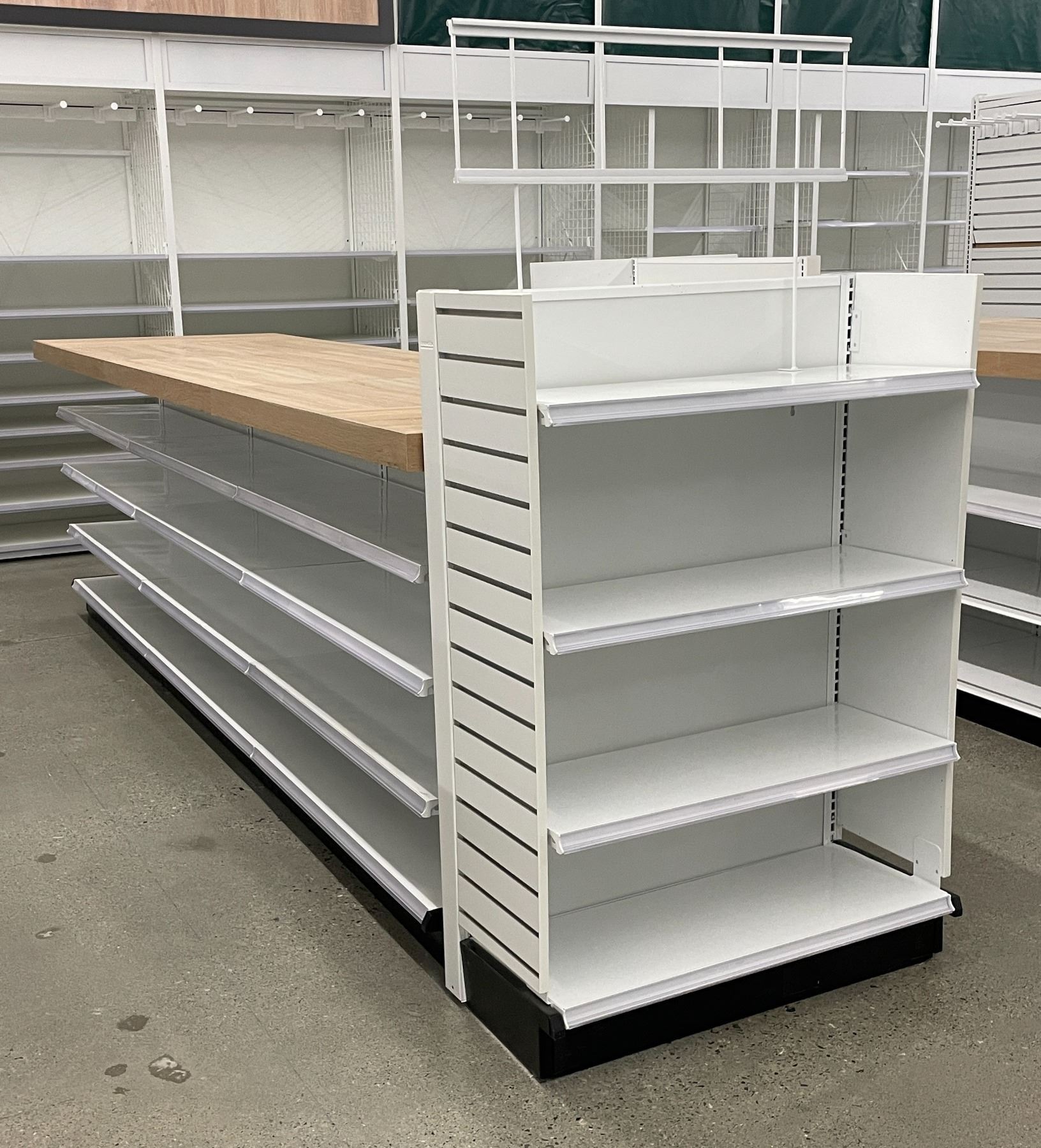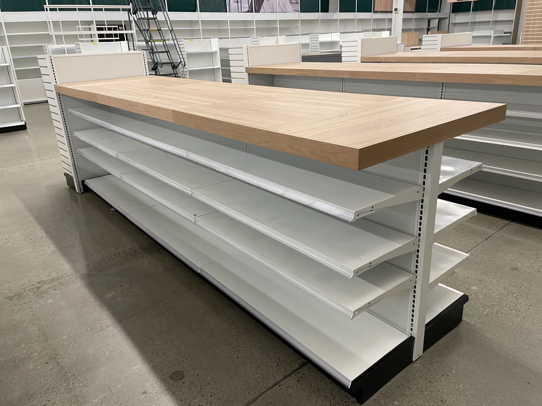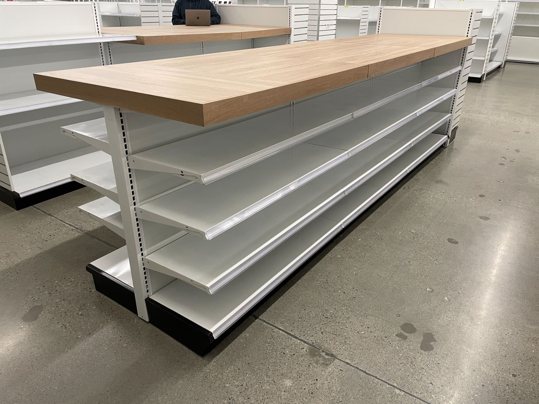 Large 4 tier retail double-sided with large wooden table top & single end cap (approx. 153in W 51 1/2in 55in H (72in w/sign holder) 40in D - excellent condition - Madix brand) BIDDERS ARE RESPONSIBLE FOR ALL COSTS ASSOCIATED WITH PICKUP OF THEIR LOTS INCLUDING BUT NOT LIMITED TO RENTAL OF EQUIPMENT, FORKLIFTS, LABOUR, TRUCKING, TOOLS ETC.