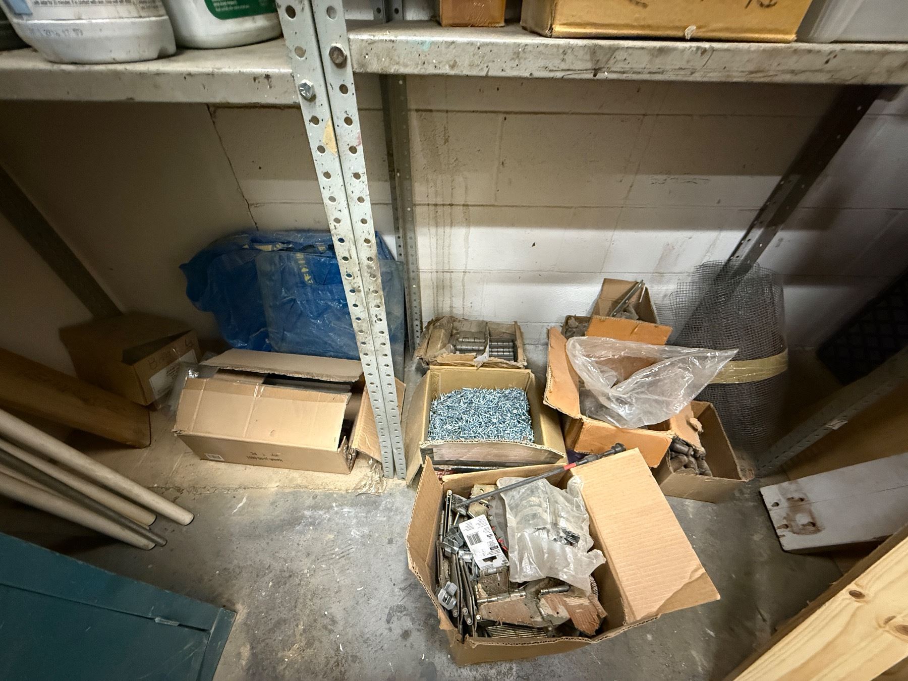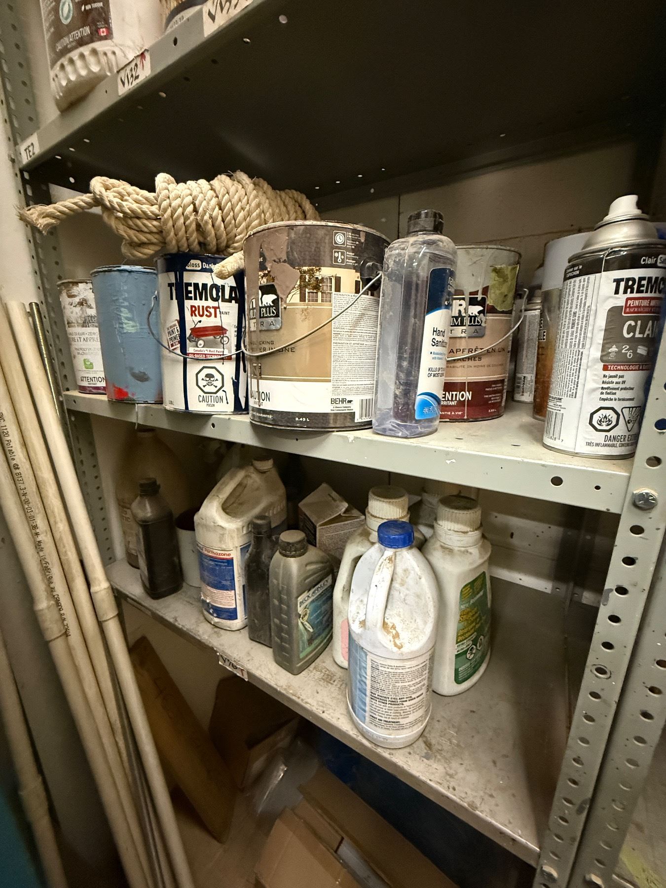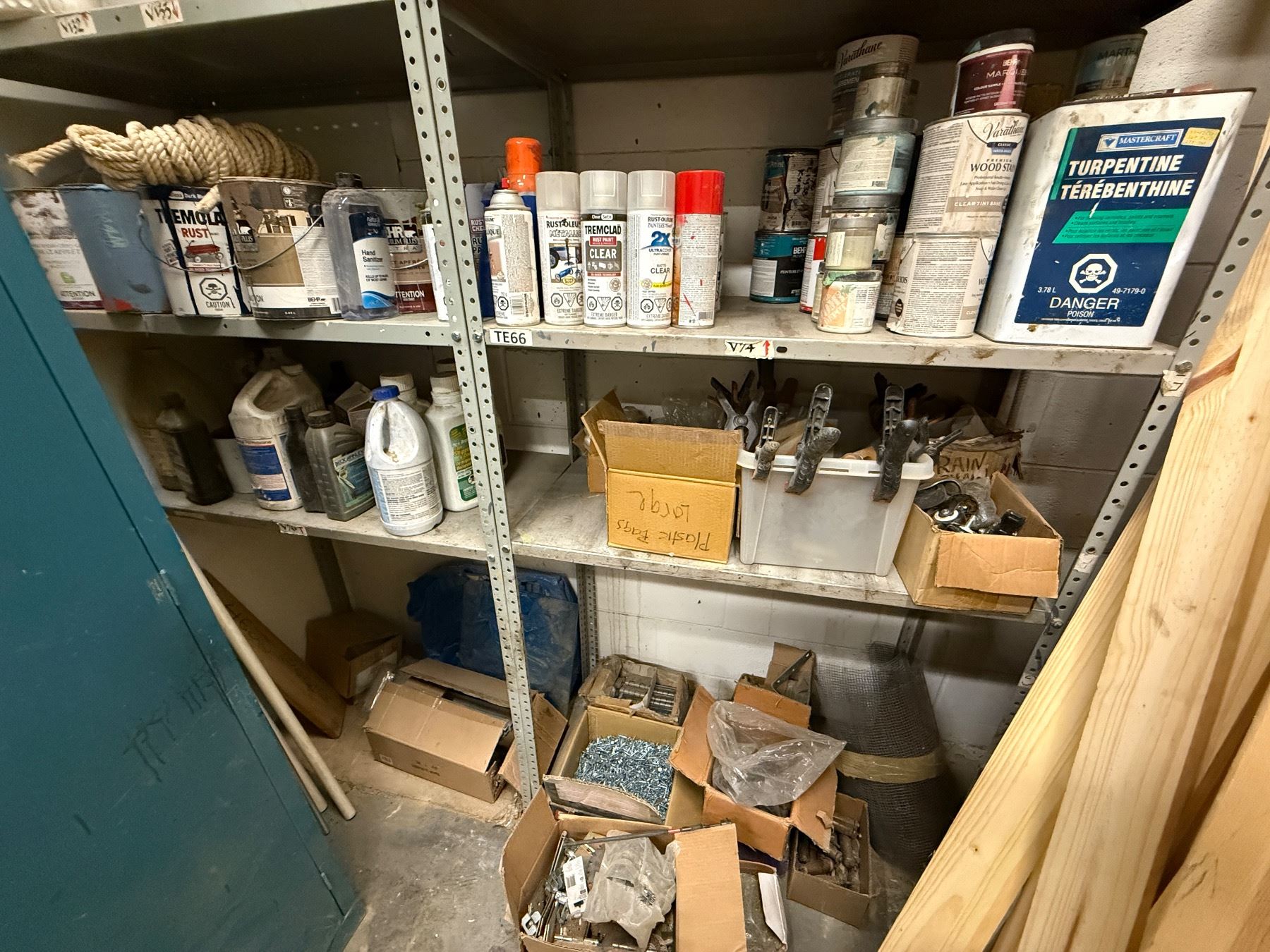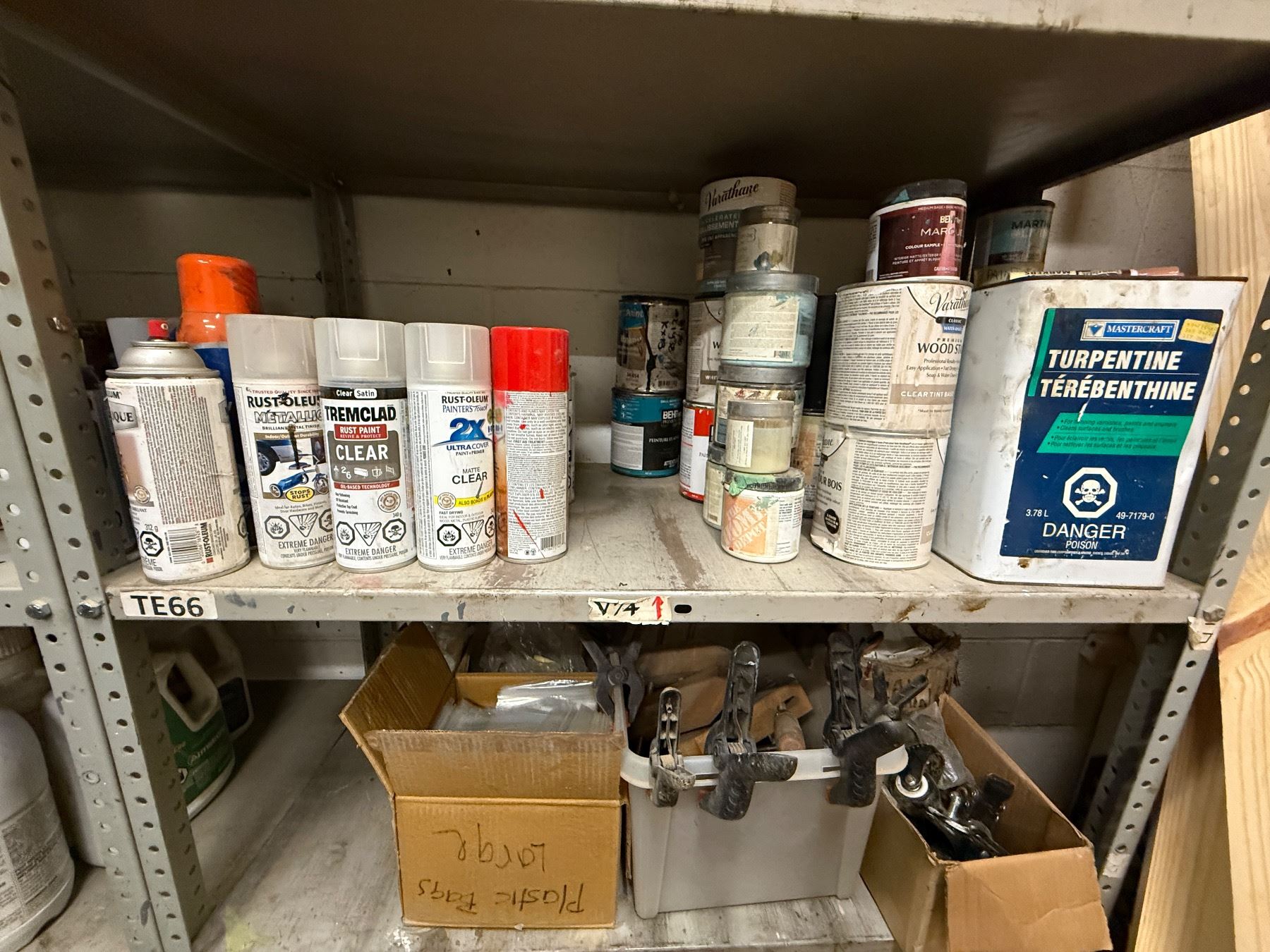 Large Assorted Workshop Lot: Paints, Stains, Spray Cans, Solvents, Clamps, Hardware & More