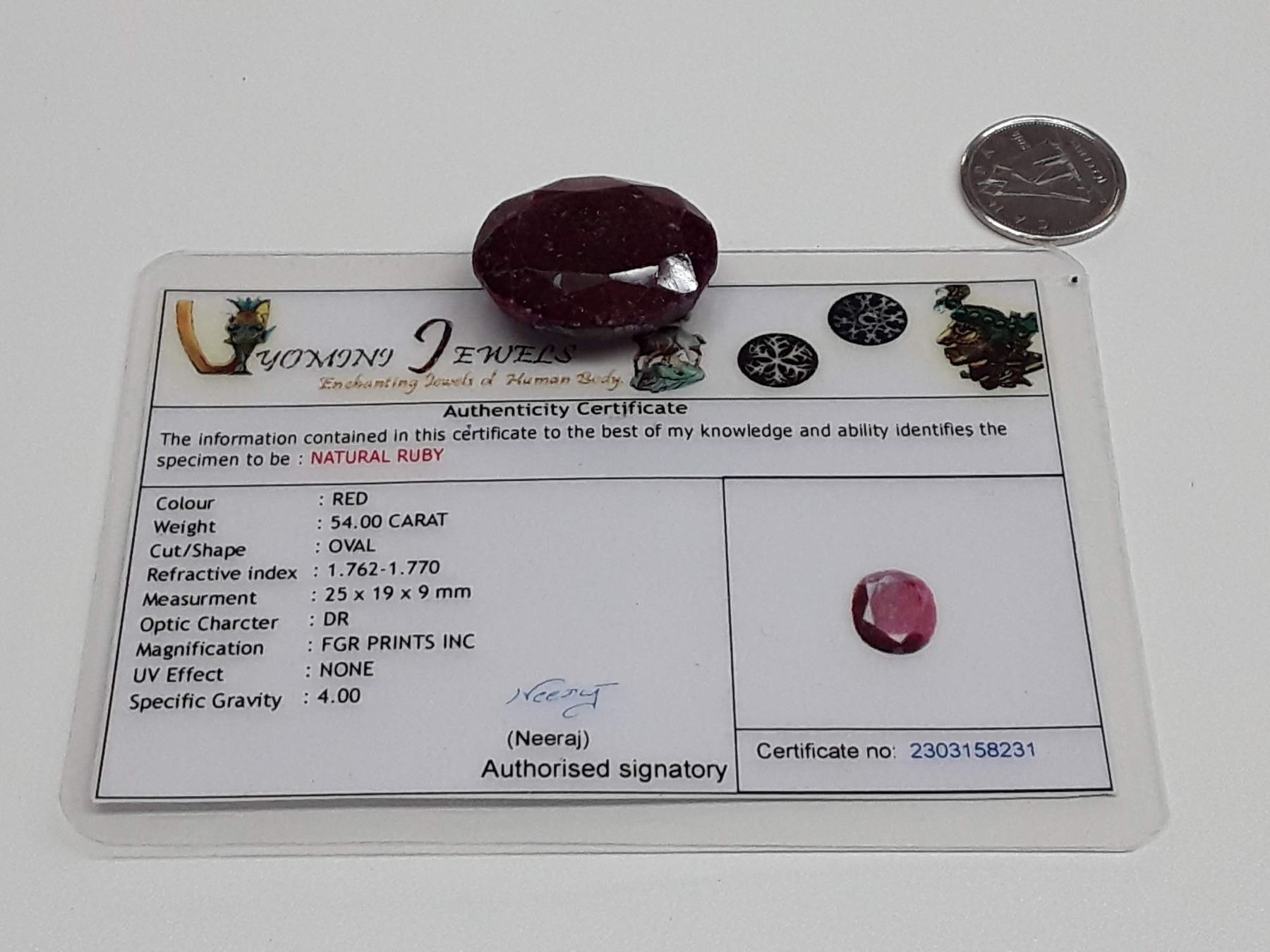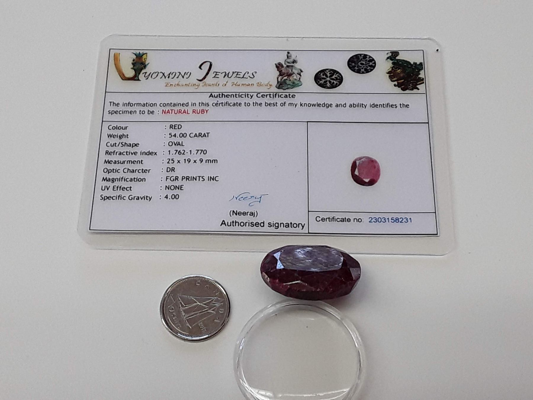 Large Authentic 54 Carat Natural Ruby Gemstone With Certificate - Oval Cut -- 17% Buyer Fee. Payment Processed through Live Auction World Saturday @ 11:15 ( Visa or Master Card ) pick up Saturday Before 3:00, or Tuesday 9:30 till 5:17