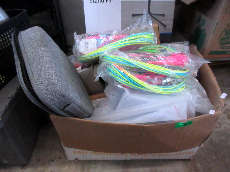 Divider trays, USB to micro cables, Christmas light tester, LED panel light, Sharper Image massage gun, and more. As is.