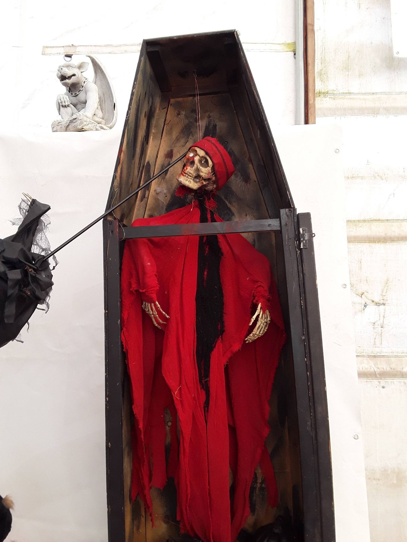 Large Casket With Red Clothed Skeleton -- 17% Buyer Fee. Payment Processed through Live Auction World Saturday @ 11:15 ( Visa or Master Card ) pick up Saturday Before 3:00, or Tuesday 9:30 till 5:28