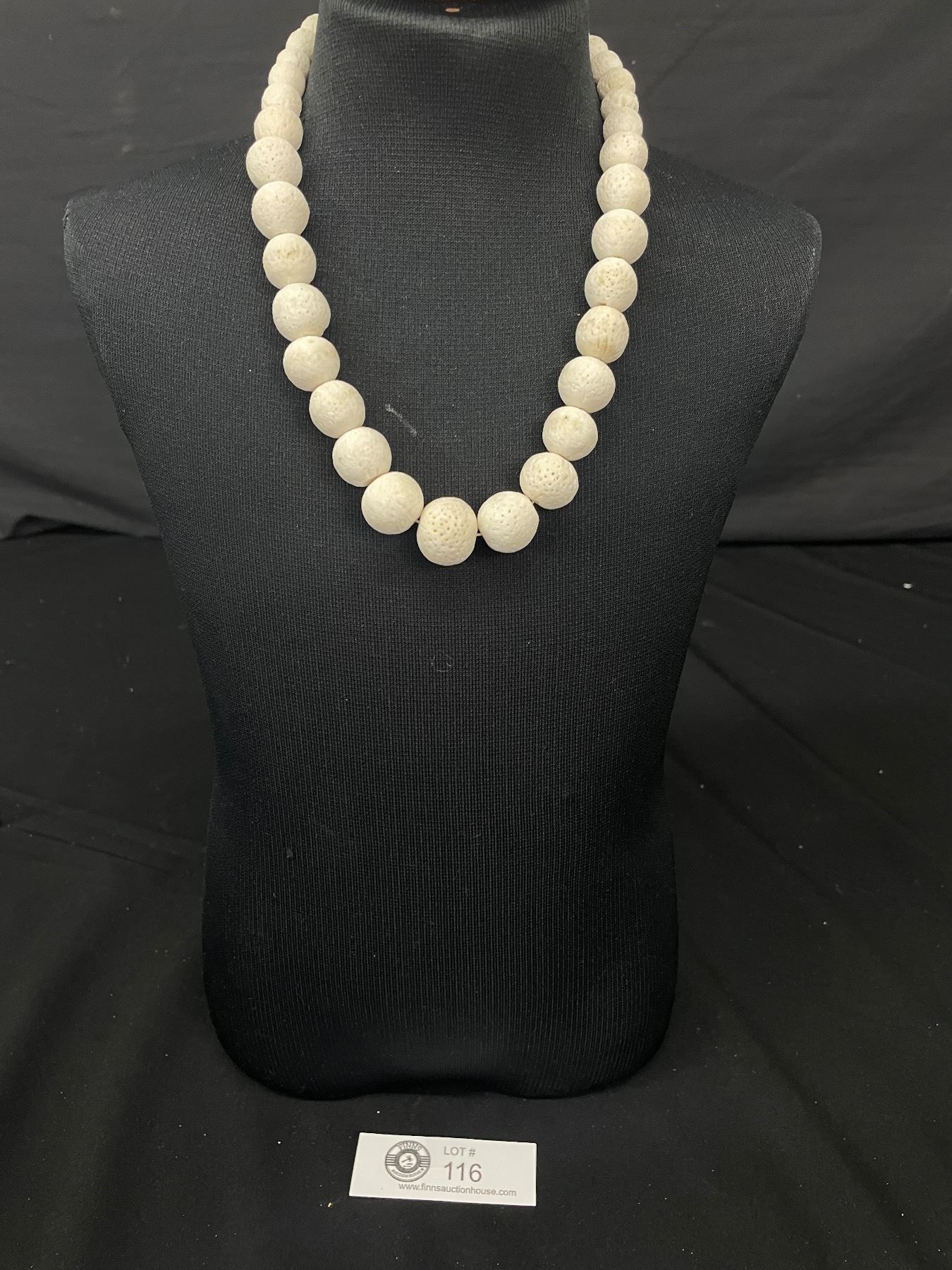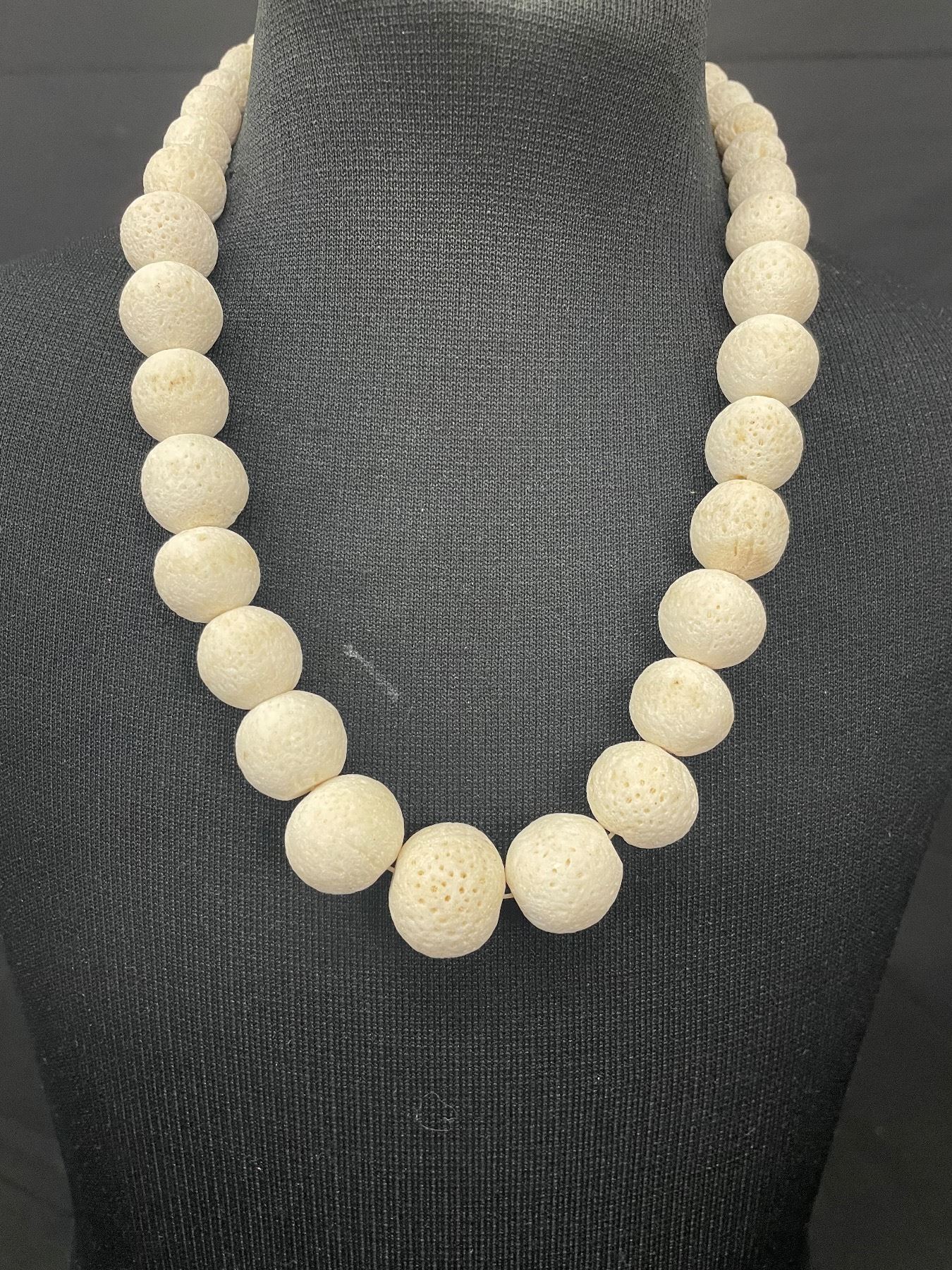 Large Graduated White Sponge Coral Bead Necklace 18" L. Largest Bead 3/4" Diameter