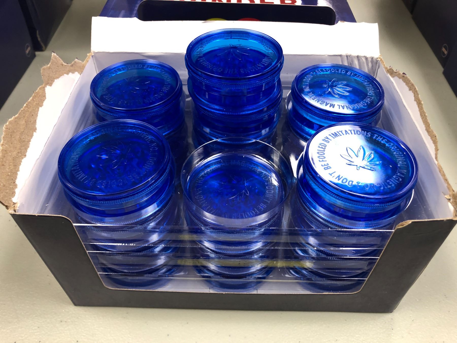 Large Group Blue Plastic Grinders Approx. 11 Boxes