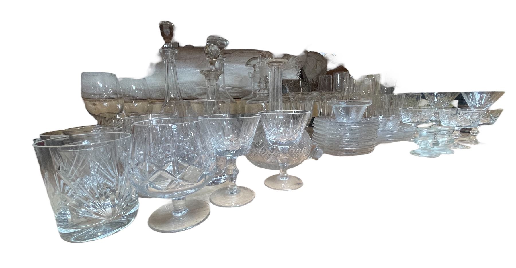 Large Group of Glassware - Cups, Plates, Decanters, Champagne Glasses, Wine Glasses, Etc.