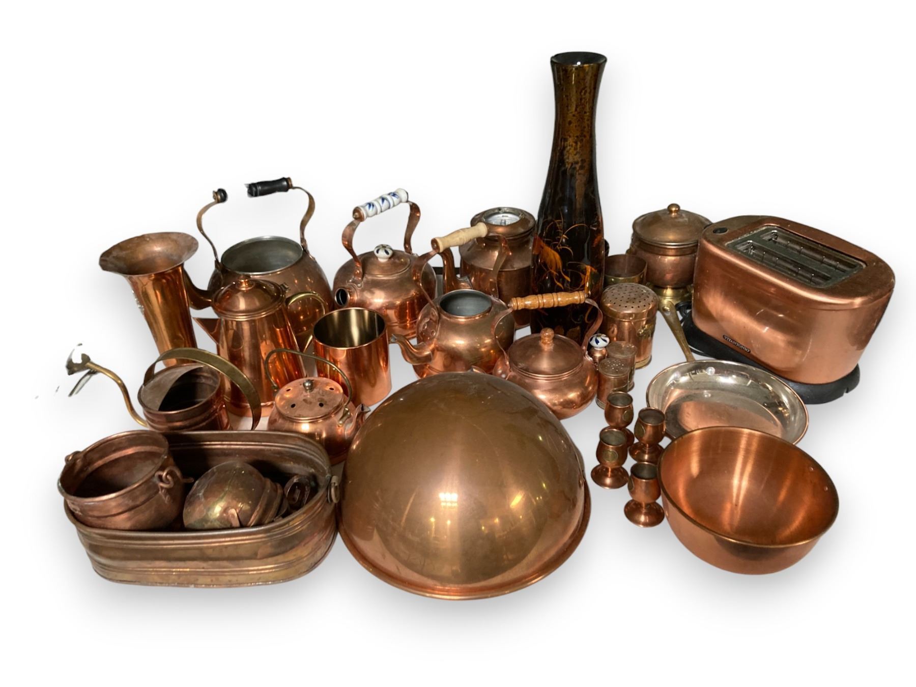 Large Group of (Possible Copper) Tea Pots, Toaster, Bows, Salt & Pepper Shakers, Vase, 4 Vintage Mexican Shot Glasses, Etc.