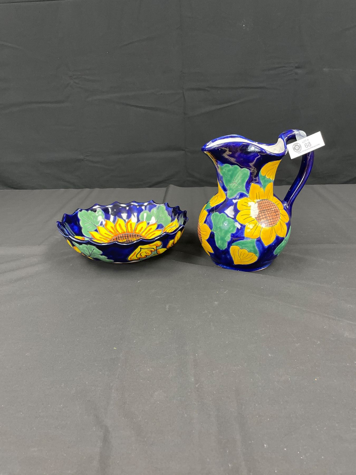 Large Hand Painted Mexican Pottery Pitcher and Bowl Cobalt Blue and Sunflower Design -Talavera?