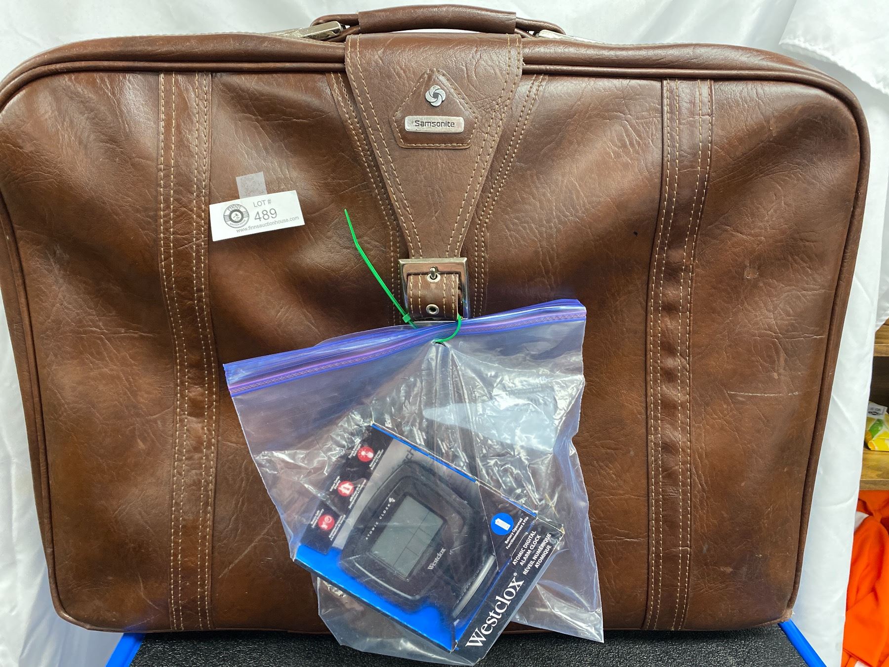 Large Leather Suitcase with a Westclox Travel Alarm Clock