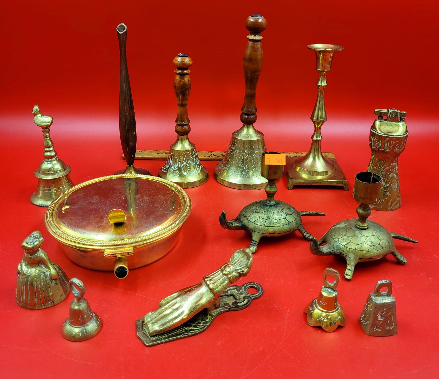 Large Lot Of Brass Items (Candle Holders, Lighter, Bells)