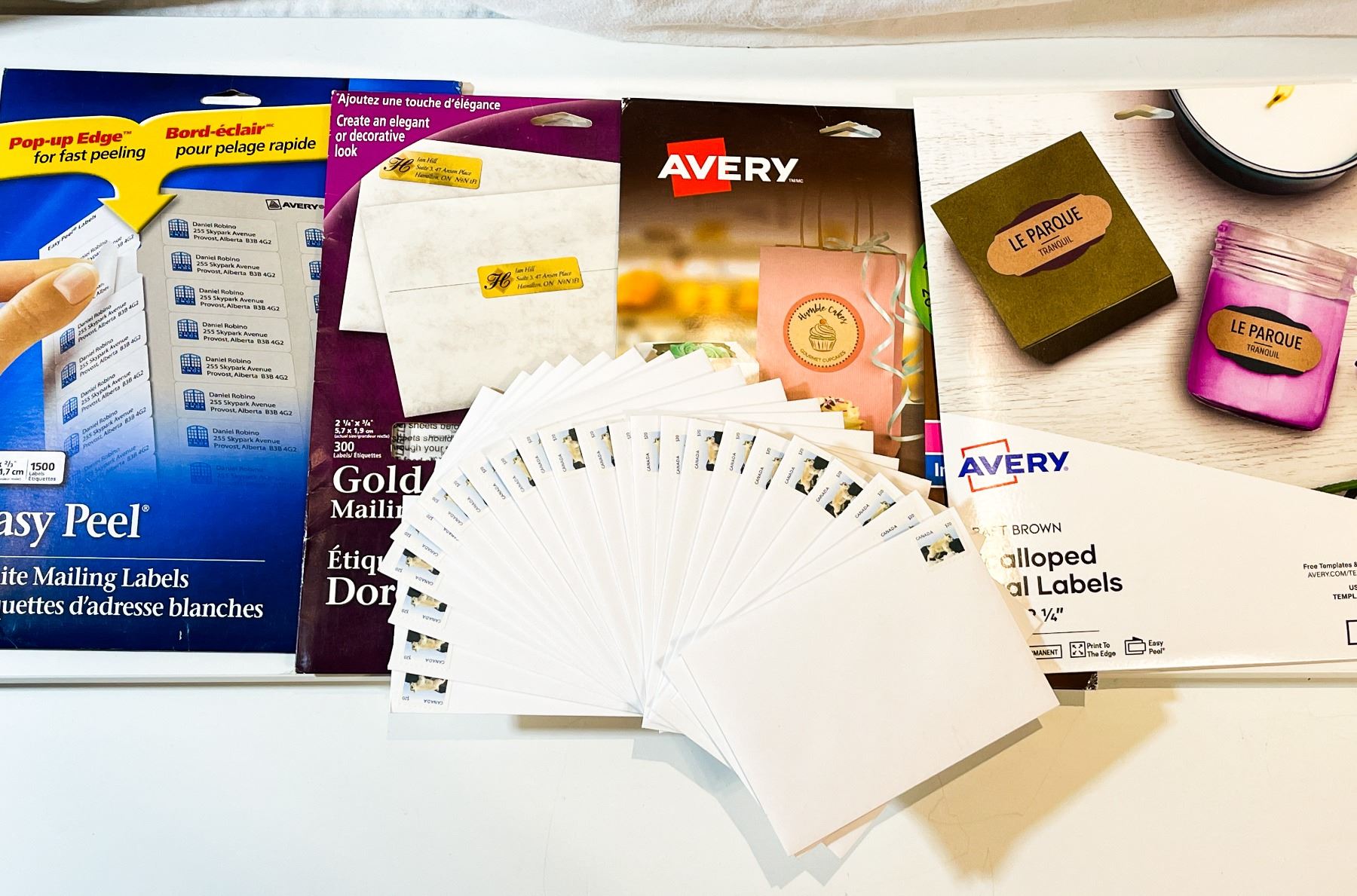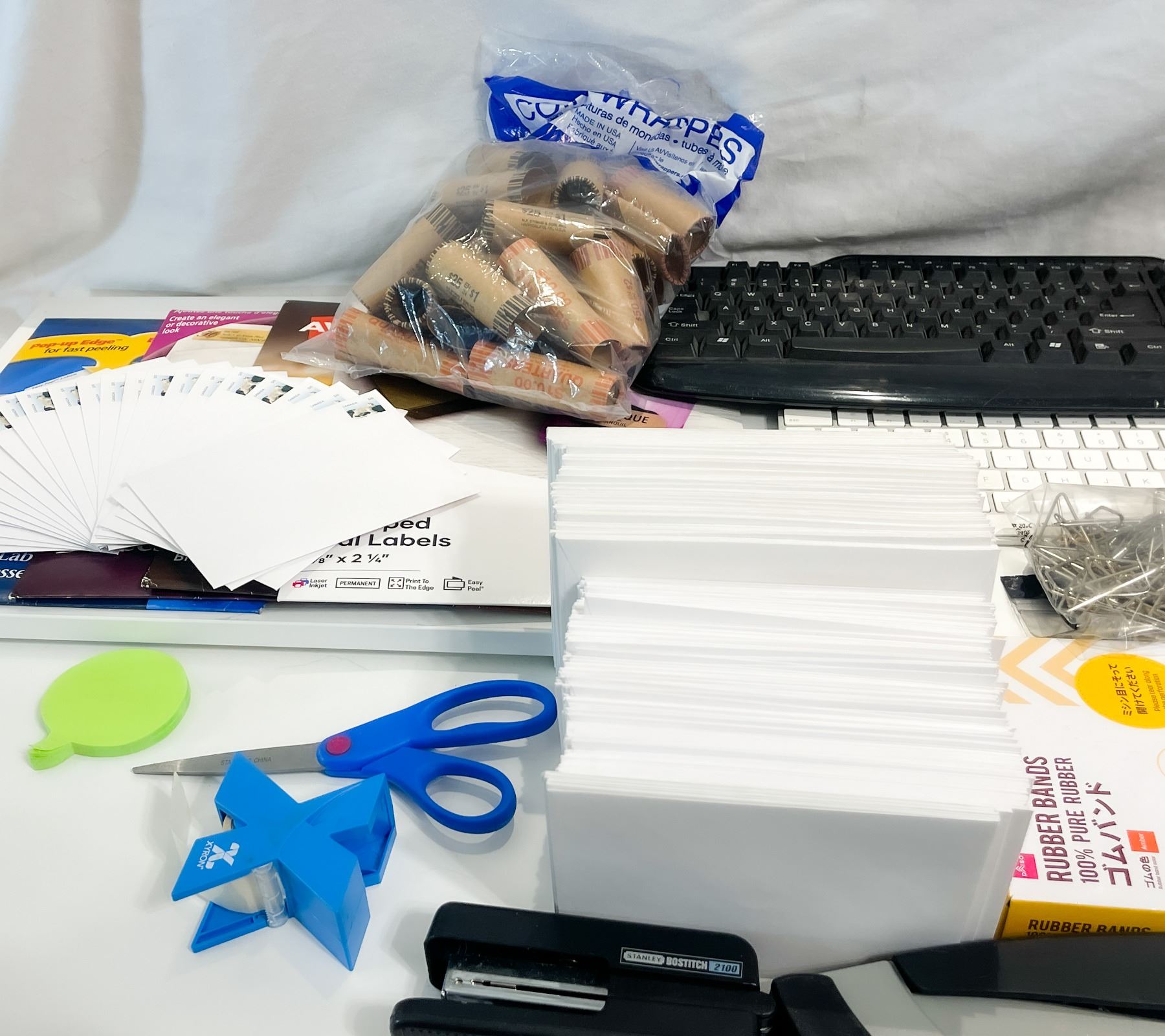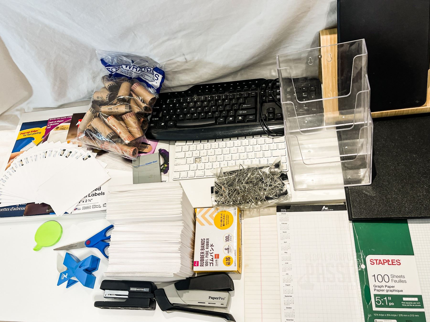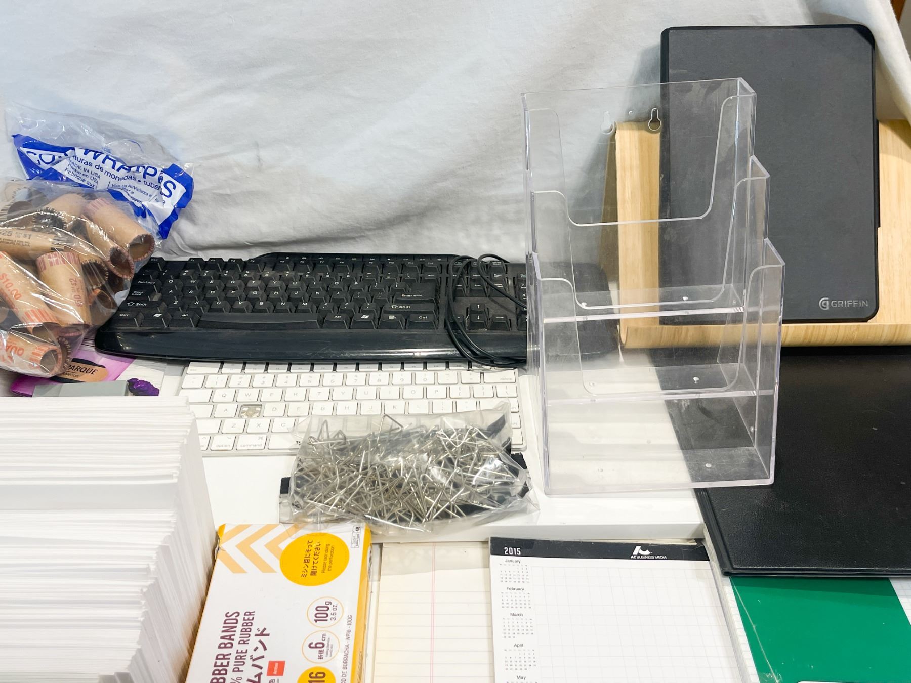 Assorted lot of office essentials including a stack of stamped envelopes, Apple keyboard (one key needs replacing), two staplers, scissors, labels, envelopes, graph paper, coin rolls, etc.