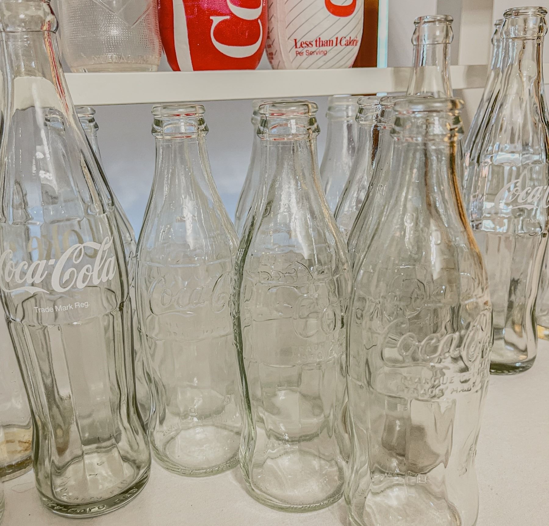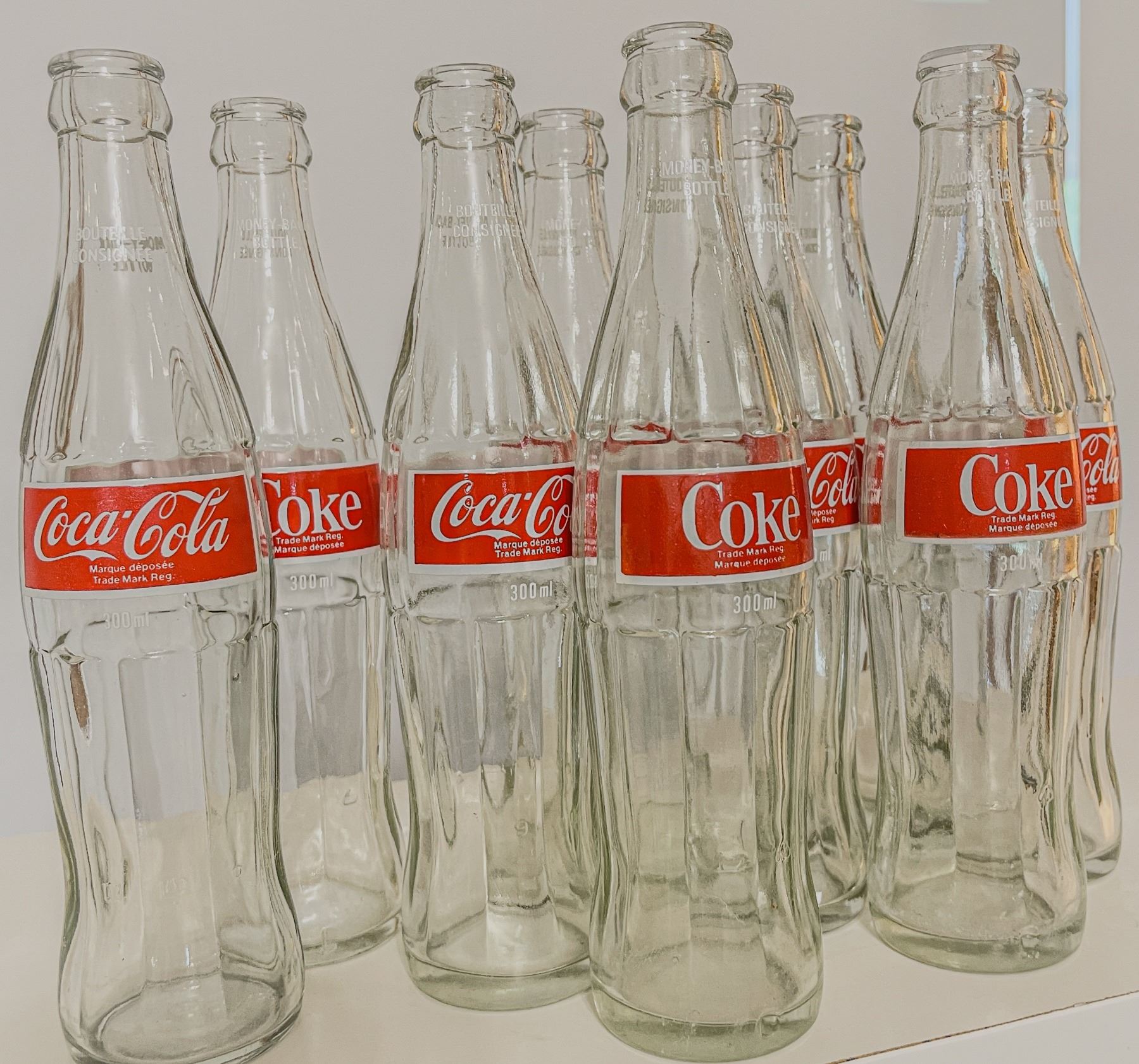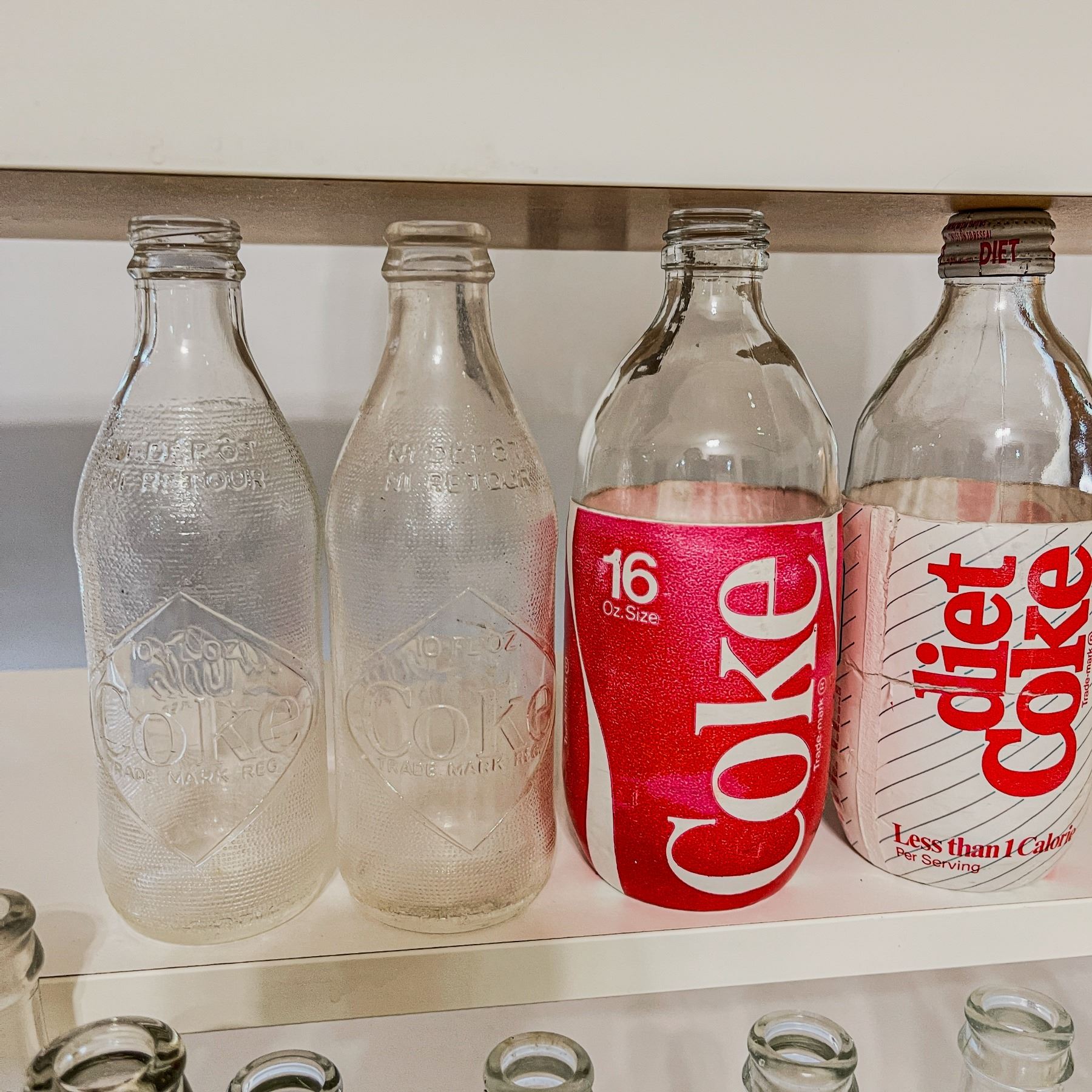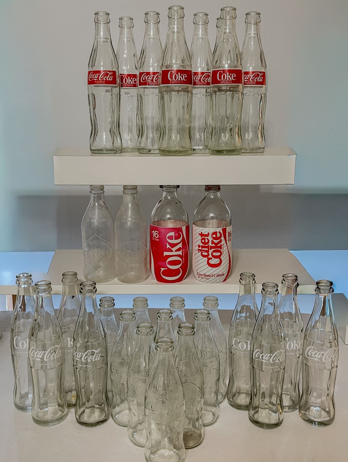 Collection of vintage Coca-Cola bottles including embossed script styles, red label glass bottles, and a few larger quart/16 oz bottles (Coke & Diet Coke). Mix of classic contour glass and straight-sided designs. Approx. 30+ bottles in total, various eras. Great display pieces or addition to a Coke memorabilia collection.