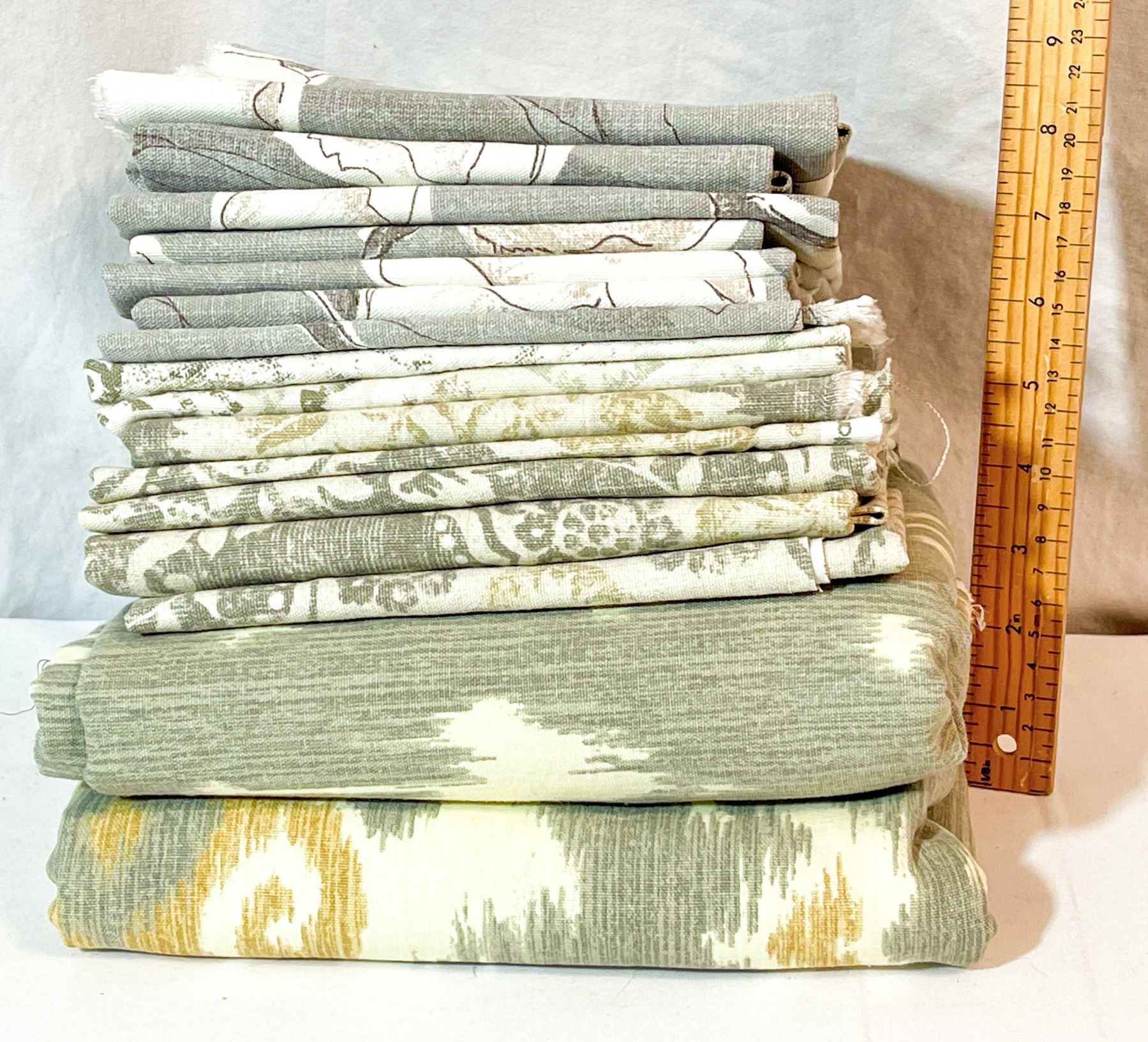 Generous lot of Magnolia brand home decor fabric featuring four coordinating patterns in soft neutral tones. Includes several large yardage pieces suitable for upholstery, curtains, or slipcovers, along with smaller cuts ideal for pillows, quilting, or trim accents. All medium to heavy weight decorator fabrics in high-quality cotton or cotton-blend weaves. Clean and neatly folded; total yardage not measured but substantial. Perfect for coordinated home projects or resale.
