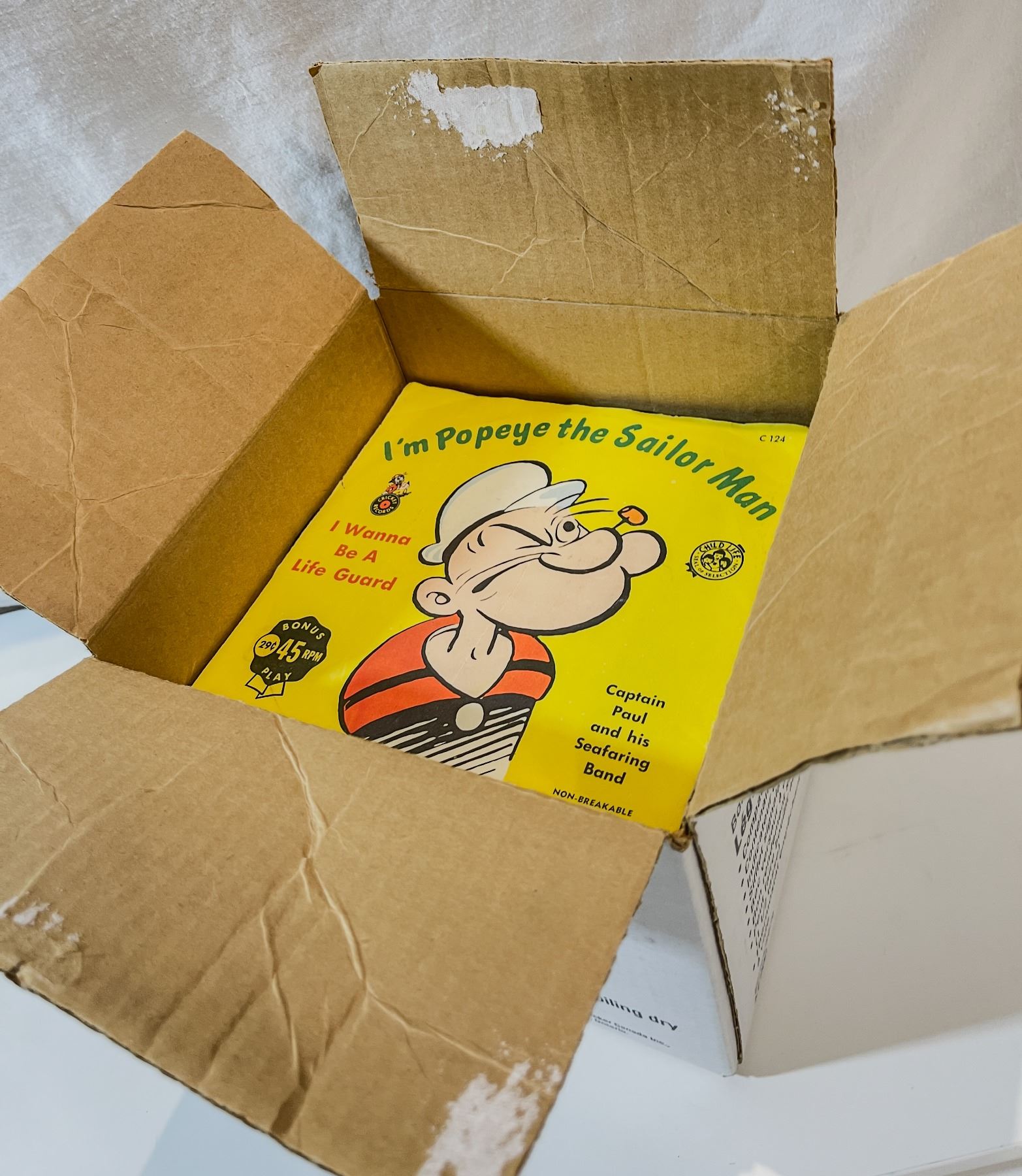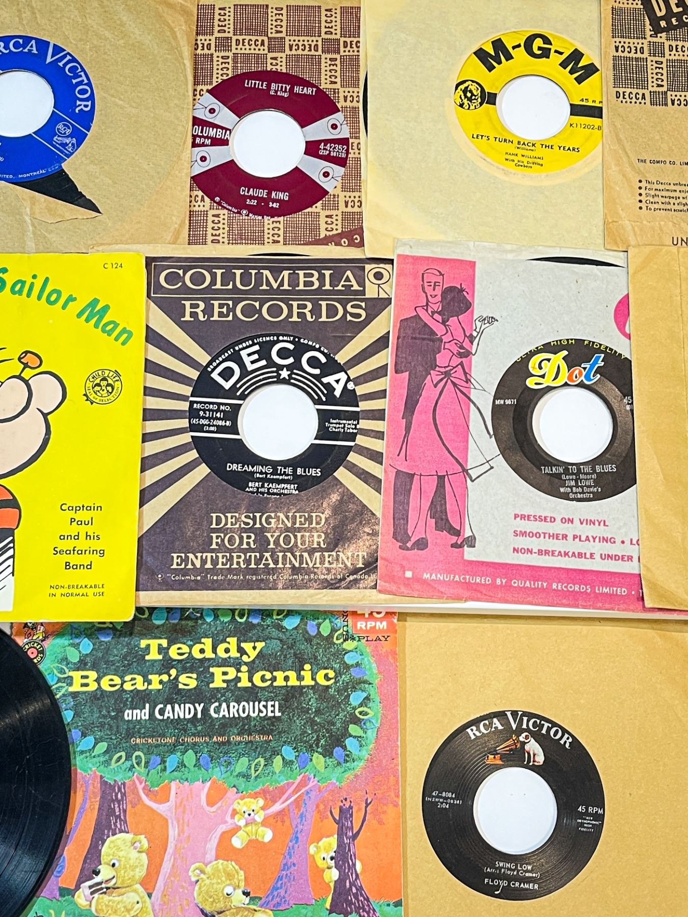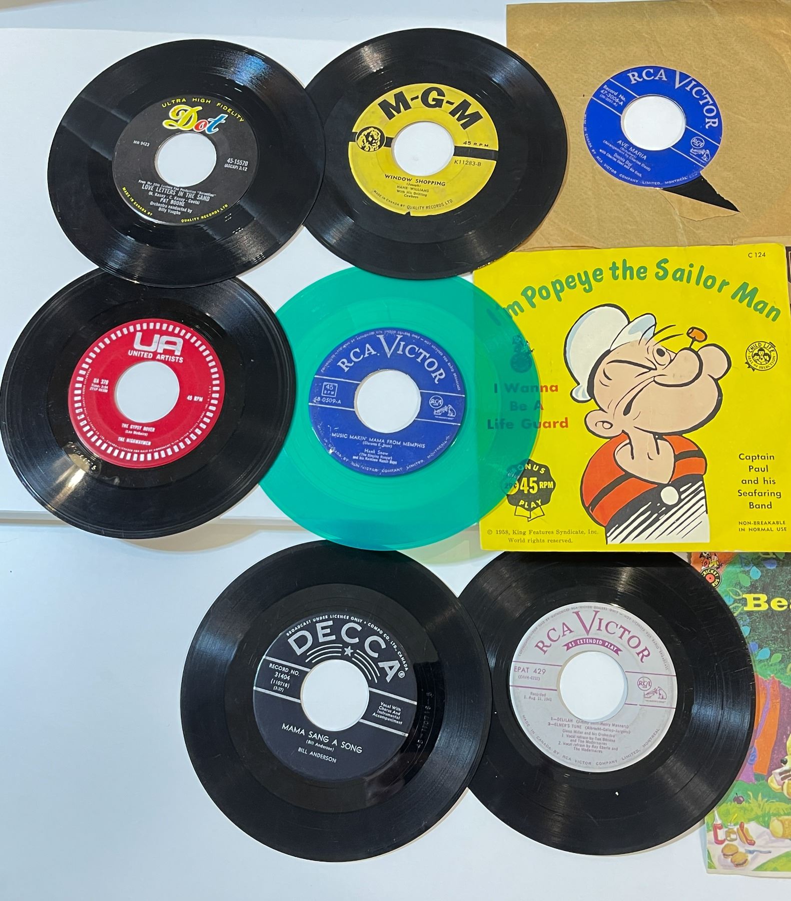 Box of assorted vintage 45 RPM records spanning multiple genres including gospel, pop, country, and novelty. Features classic labels such as RCA Victor, Columbia, Decca, Dot, MGM, PolyGram, and Sun, with artists like Johnny Cash, Billy Vaughn, and Paul Simon among others. Includes both colored vinyl and picture sleeves like Popeye the Sailor Man and Teddy Bear’s Picnic. The records shown are only a small sample