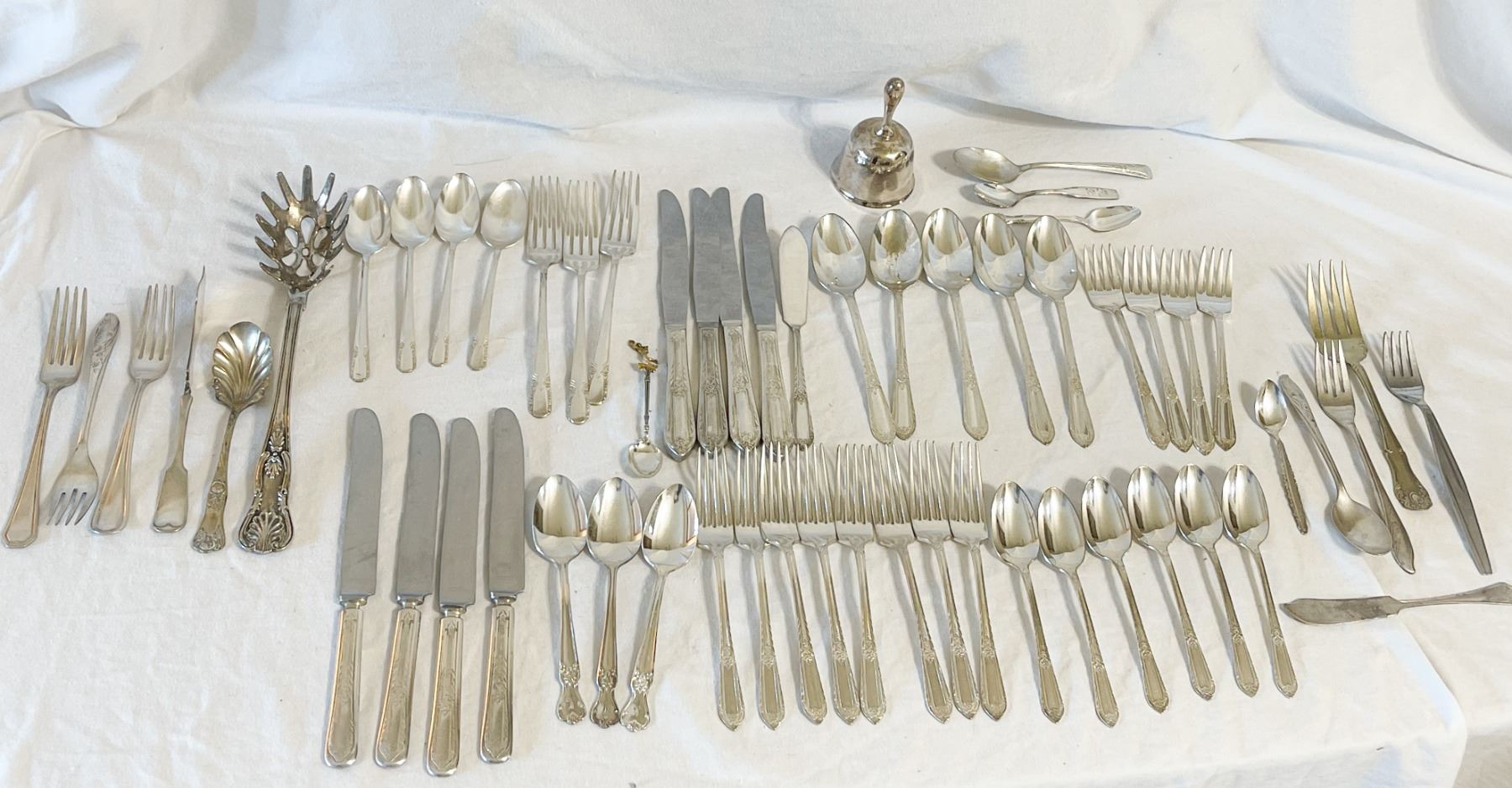 Assorted collection of vintage silver-plated flatware including a variety of forks, knives, spoons, serving pieces, and specialty utensils. Mixed makers and patterns
