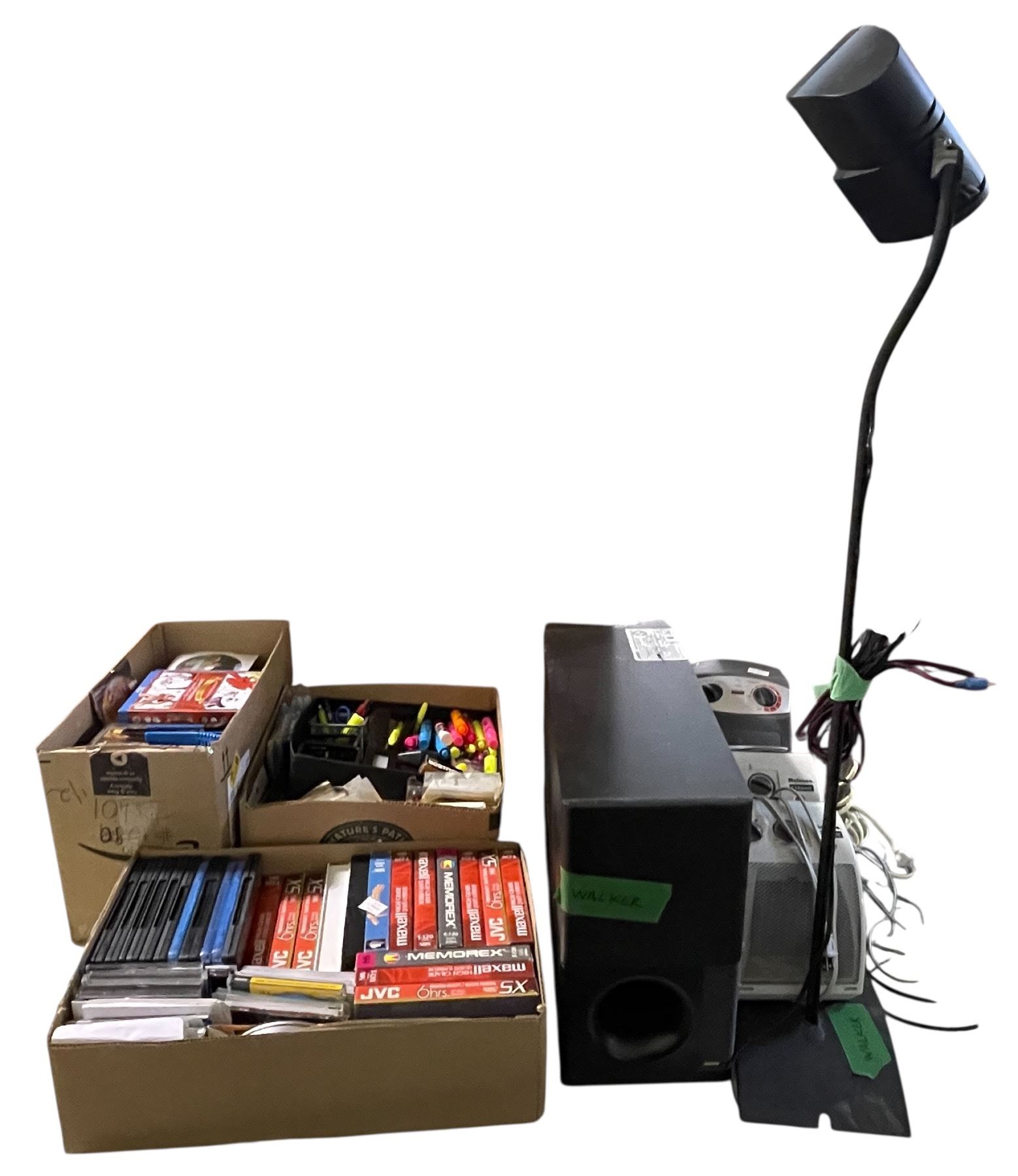 Large Office Supplies and Electronics Lot - Cables, CD Cases, VHS, Speakers, Etc.