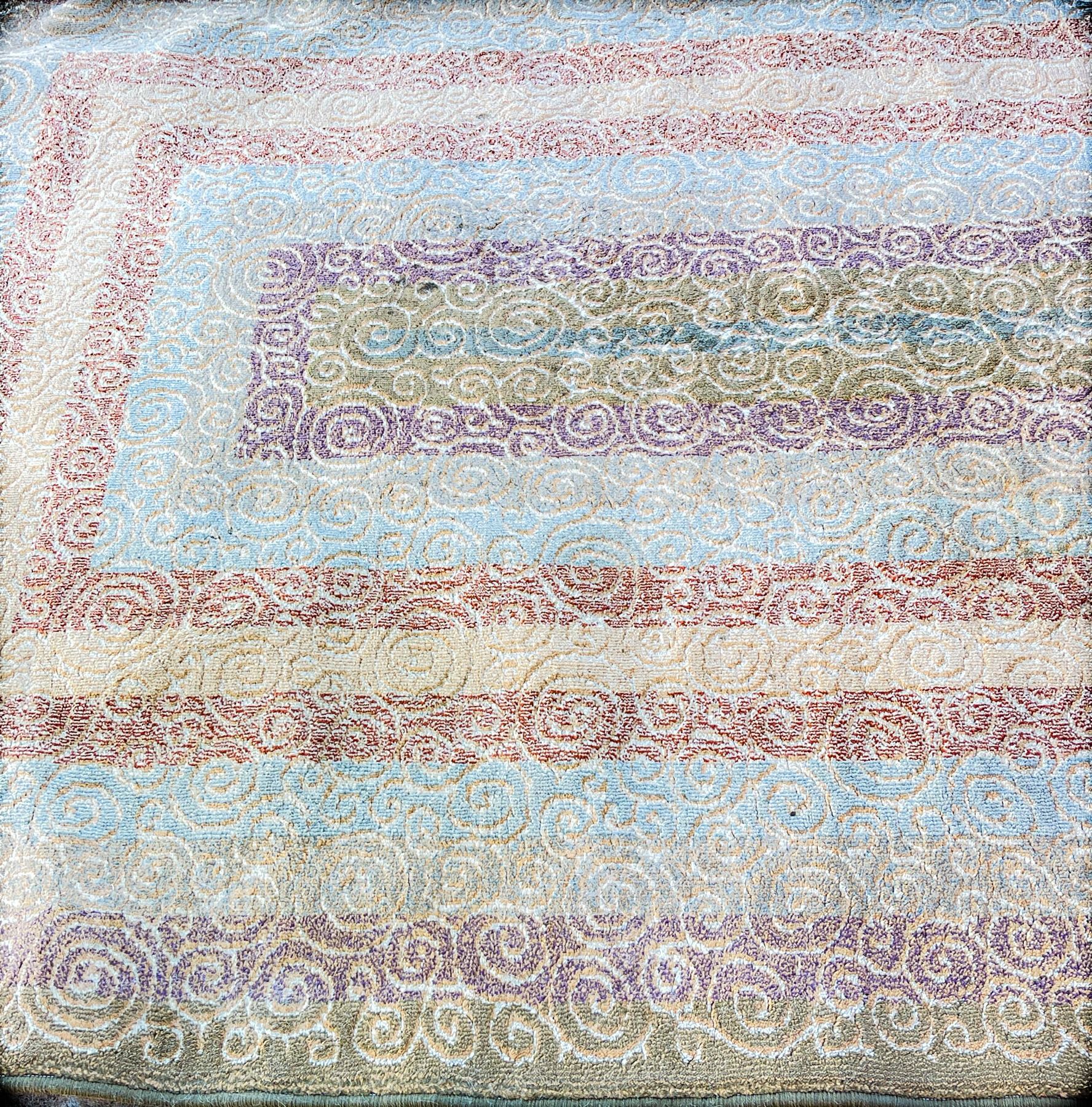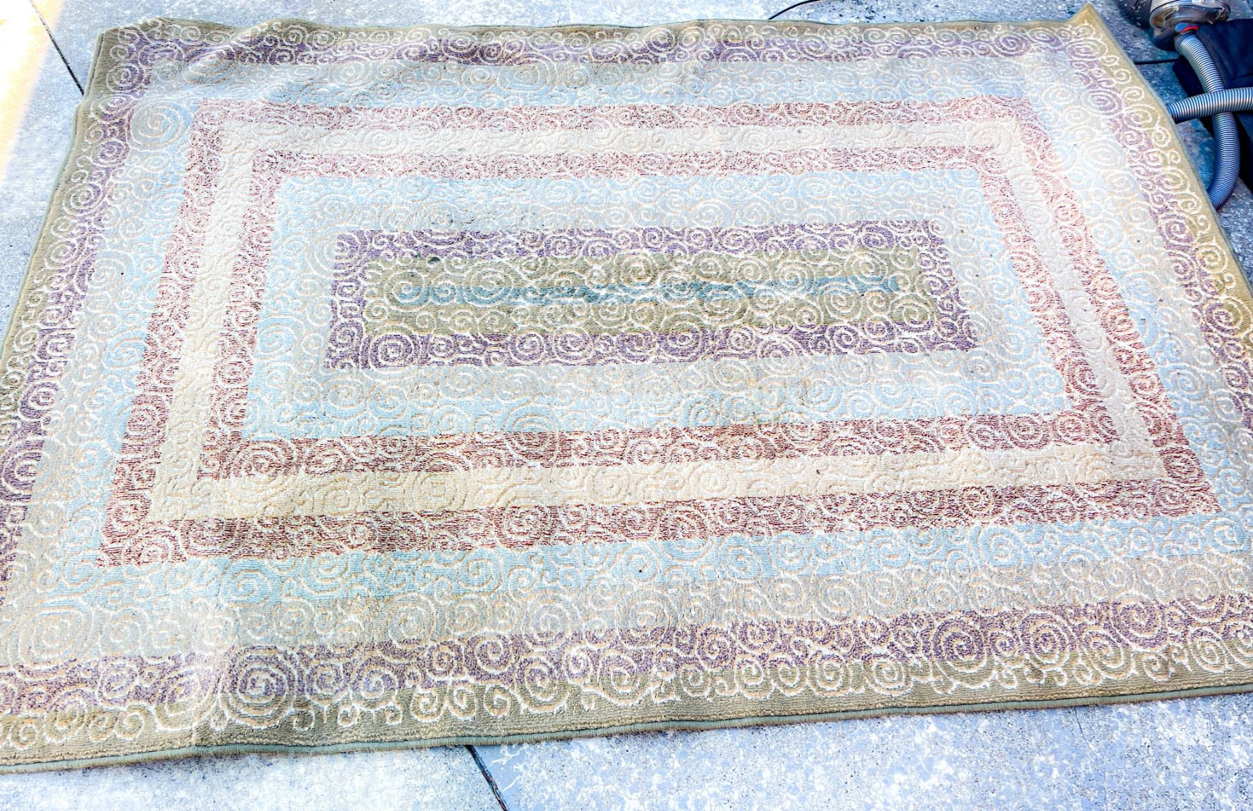 Beautiful rectangular throw carpet featuring a modern swirl design in muted earth tones . Measures approximately 64" x 92". Very good used condition with light wear.