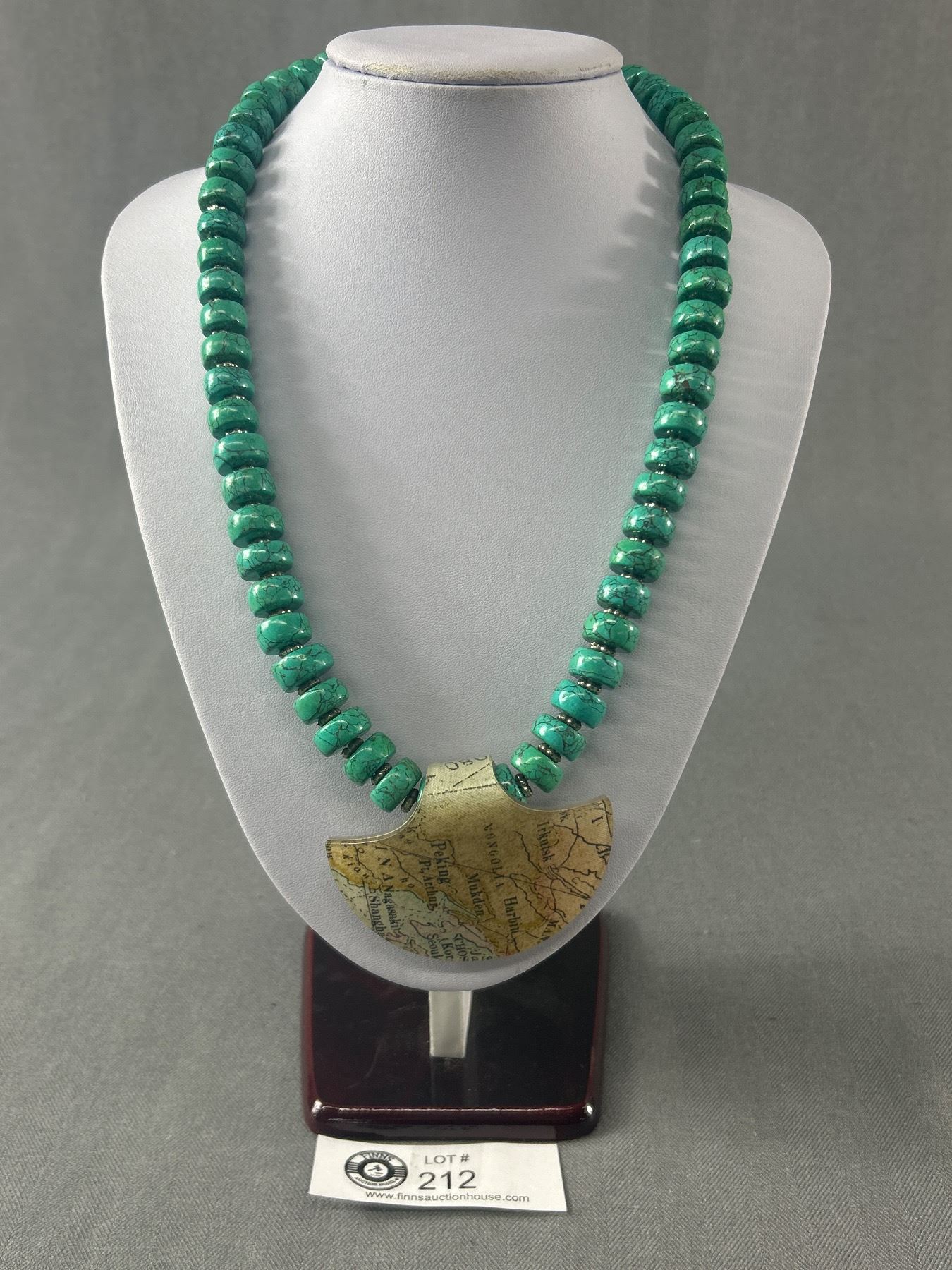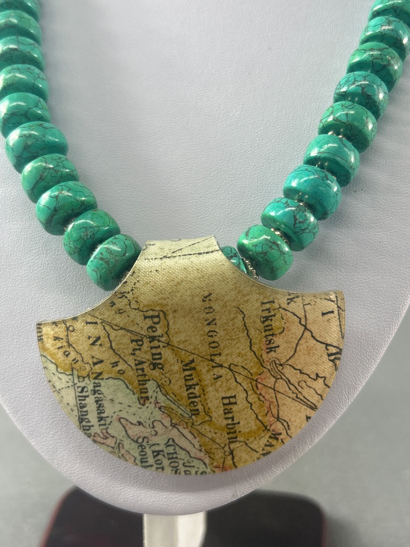 Large Rondelle Turquoise Beads Necklace w/ Eastern Map Pendant